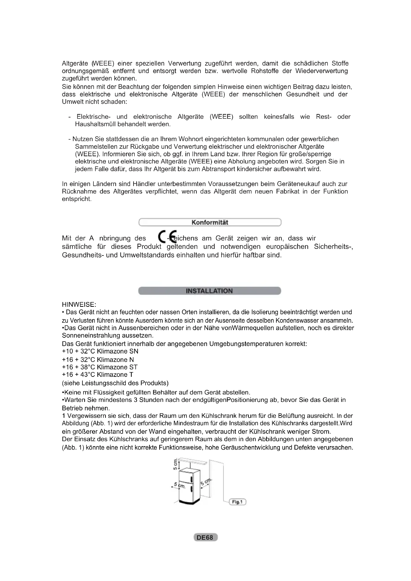 Altgeräte ( WEEE) einer speziellen Verwertung zugeführt werden, damit die schädlichen Stoffe ordnungsgemäß entfernt und entsorgt werden bzw. wertvolle Rohstoffe der Wiederverwertung zugeführt werden können. Sie können mit der Beachtung der folgenden simplen Hinweise einen wichtigen Beitrag dazu leisten, dass elektrische und elektronische Altgeräte (WEEE) der menschlichen Gesundheit und der Umwelt nicht schaden: - Elektrische- und elektronische Altgeräte (WEEE) sollten keinesfalls wie Rest- oder Haushaltsmüll behandelt werden. - Nutzen Sie stattdessen die an Ihrem Wohnort eingerichteten kommunalen oder gewerblichen Sammelstellen zur Rückgabe und Verwertung elektrischer und elektronischer Altgeräte (WEEE). Informieren Sie sich, ob ggf. in Ihrem Land bzw. Ihrer Region für große/sperrige elektrische und elektronische Altgeräte (WEEE) eine Abholung angeboten wird. Sorgen Sie in jedem Falle dafür, dass Ihr Altgerät bis zum Abtransport kindersicher aufbewahrt wird. In einigen Ländern sind Händler unterbestimmten Voraussetzungen beim Geräteneukauf auch zur Rücknahme des Altgerätes verpflichtet, wenn das Altgerät dem neuen Fabrikat in der Funktion entspricht. Mit der A nbringung des -Zeichens am Gerät zeigen wir an, dass wir sämtliche für dieses Produkt geltenden und notwendigen europäischen Sicherheits-, Gesundheits- und Umweltstandards einhalten und hierfür haftbar sind. 68DE kein Display Kühlraum Umluftkühlung (falls vorhanden) Der Ventilator ist werkseitig auf OFF eingestellt. Um zu aktivieren, drücken Sie den Schalter (Abb. 6) Um den Energieverbrauch zu optimieren, ist es empfehlenswert, dass Sie den Ventilator nur einschalten, wenn die Umgebungslufttemperatur 28/30 °C übersteigt.