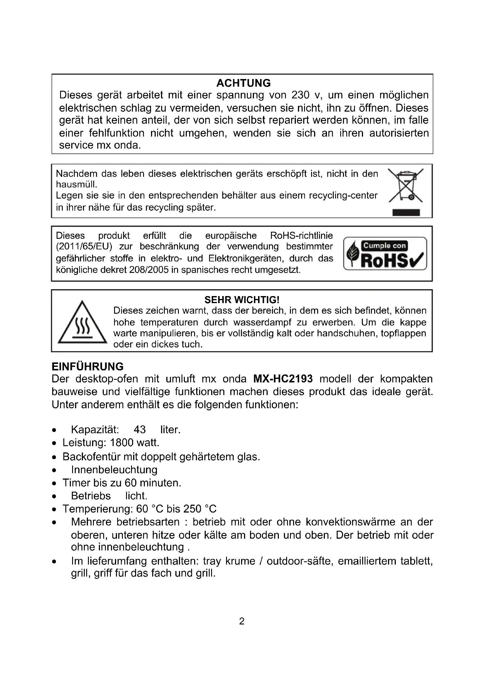 SEHR WICHTIG! Dieses zeichen warnt, dass der bereich, in dem es sich befindet, können hohe temperaturen durch wasserdampf zu erwerben. Um die kappe warte manipulieren, bis er vollständig kalt oder handschuhen, topflappen oder ein dickes tuch. EINFÜHRUNG Der desktop-ofen mit umluft mx onda MX-HC2193 modell der kompakten bauweise und vielfältige funktionen machen dieses produkt das ideale gerät. Unter anderem enthält es die folgenden funktionen:
