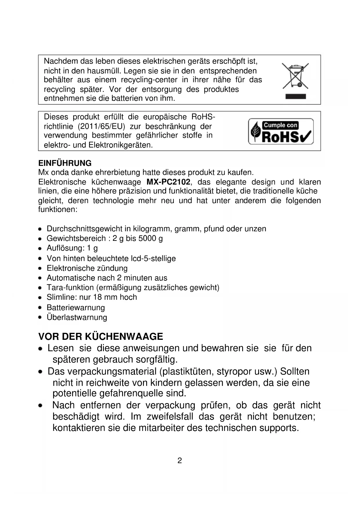 Nachdem das leben dieses elektrischen geräts erschöpft ist, nicht in den hausmüll. Legen sie sie in den entsprechenden behälter aus einem recycling-center in ihrer nähe für das recycling später. Vor der entsorgung des produktes entnehmen sie die batterien von ihm. Dieses produkt erfüllt die europäische RoHS- richtlinie (2011/65/EU) zur beschränkung der verwendung bestimmter gefährlicher stoffe in elektro- und Elektronikgeräten. EINFÜHRUNG Mx onda danke ehrerbietung hatte dieses produkt zu kaufen. Elektronische küchenwaage MX-PC2102, das elegante design und klaren linien, die eine höhere präzision und funktionalität bietet, die traditionelle küche gleicht, deren technologie mehr neu und hat unter anderem die folgenden funktionen: Durchschnittsgewicht in kilogramm, gramm, pfund oder unzen Gewichtsbereich : 2 g bis 5000 g Auflösung: 1 g Von hinten beleuchtete lcd-5-stellige Elektronische zündung Automatische nach 2 minuten aus Tara-funktion (ermäßigung zusätzliches gewicht) Slimline: nur 18 mm hoch Batteriewarnung Überlastwarnung