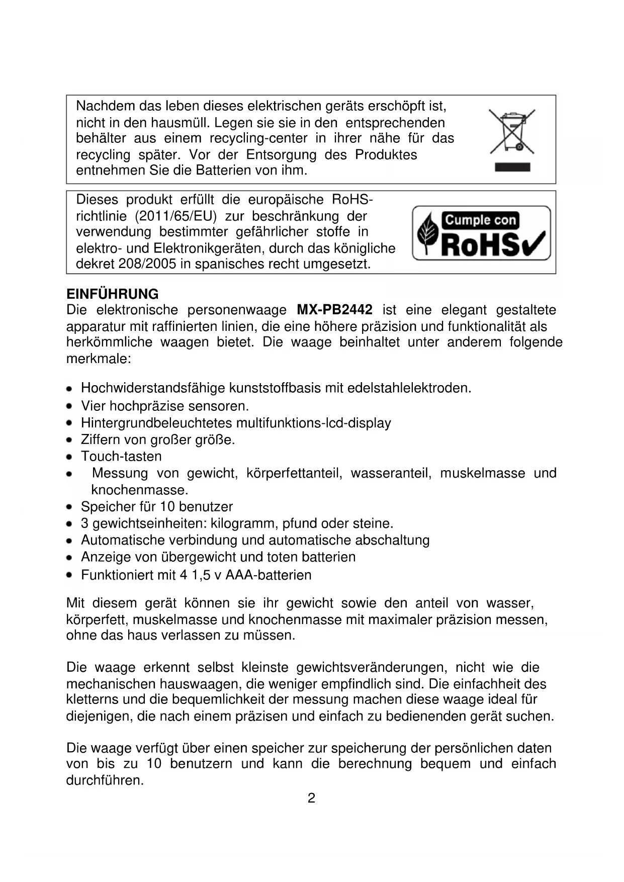 Nachdem das leben dieses elektrischen geräts erschöpft ist, nicht in den hausmüll. Legen sie sie in den entsprechenden behälter aus einem recycling-center in ihrer nähe für das recycling später. Vor der Entsorgung des Produktes entnehmen Sie die Batterien von ihm. Dieses produkt erfüllt die europäische RoHS- richtlinie (2011/65/EU) zur beschränkung der verwendung bestimmter gefährlicher stoffe in elektro- und Elektronikgeräten, durch das königliche dekret 208/2005 in spanisches recht umgesetzt. EINFÜHRUNG Die elektronische personenwaage MX-PB2442 ist eine elegant gestaltete apparatur mit raffinierten linien, die eine höhere präzision und funktionalität als herkömmliche waagen bietet. Die waage beinhaltet unter anderem folgende merkmale: Hochwiderstandsfähige kunststoffbasis mit edelstahlelektroden. Vier hochpräzise sensoren. Hintergrundbeleuchtetes multifunktions-lcd-display Ziffern von großer größe. Touch-tasten Messung von gewicht, körperfettanteil, wasseranteil, muskelmasse und knochenmasse. Speicher für 10 benutzer 3 gewichtseinheiten: kilogramm, pfund oder steine. Automatische verbindung und automatische abschaltung Anzeige von übergewicht und toten batterien Funktioniert mit 4 1,5 v AAA-batterien Mit diesem gerät können sie ihr gewicht sowie den anteil von wasser, körperfett, muskelmasse und knochenmasse mit maximaler präzision messen, ohne das haus verlassen zu müssen. Die waage erkennt selbst kleinste gewichtsveränderungen, nicht wie die mechanischen hauswaagen, die weniger empfindlich sind. Die einfachheit des kletterns und die bequemlichkeit der messung machen diese waage ideal für diejenigen, die nach einem präzisen und einfach zu bedienenden gerät suchen. Die waage verfügt über einen speicher zur speicherung der persönlichen daten von bis zu 10 benutzern und kann die berechnung bequem und einfach durchführen.3