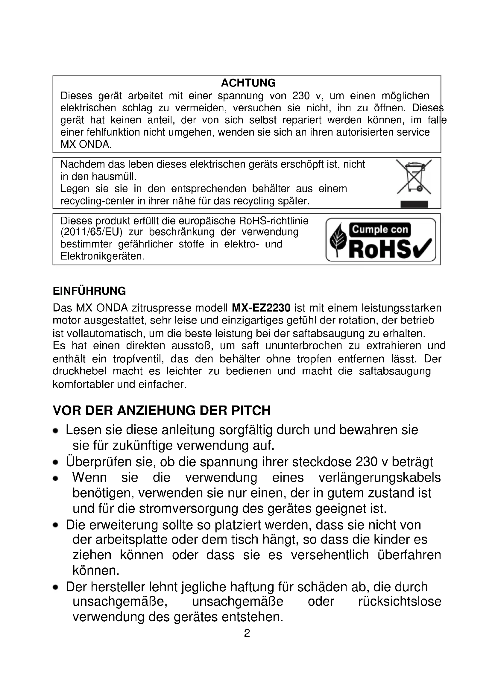 ACHTUNG Dieses gerät arbeitet mit einer spannung von 230 v, um einen möglichen elektrischen schlag zu vermeiden, versuchen sie nicht, ihn zu öffnen. Dieses gerät hat keinen anteil, der von sich selbst repariert werden können, im falle einer fehlfunktion nicht umgehen, wenden sie sich an ihren autorisierten service MX ONDA. Nachdem das leben dieses elektrischen geräts erschöpft ist, nicht in den hausmüll. Legen sie sie in den entsprechenden behälter aus einem recycling-center in ihrer nähe für das recycling später. Dieses produkt erfüllt die europäische RoHS-richtlinie (2011/65/EU) zur beschränkung der verwendung bestimmter gefährlicher stoffe in elektro- und Elektronikgeräten.