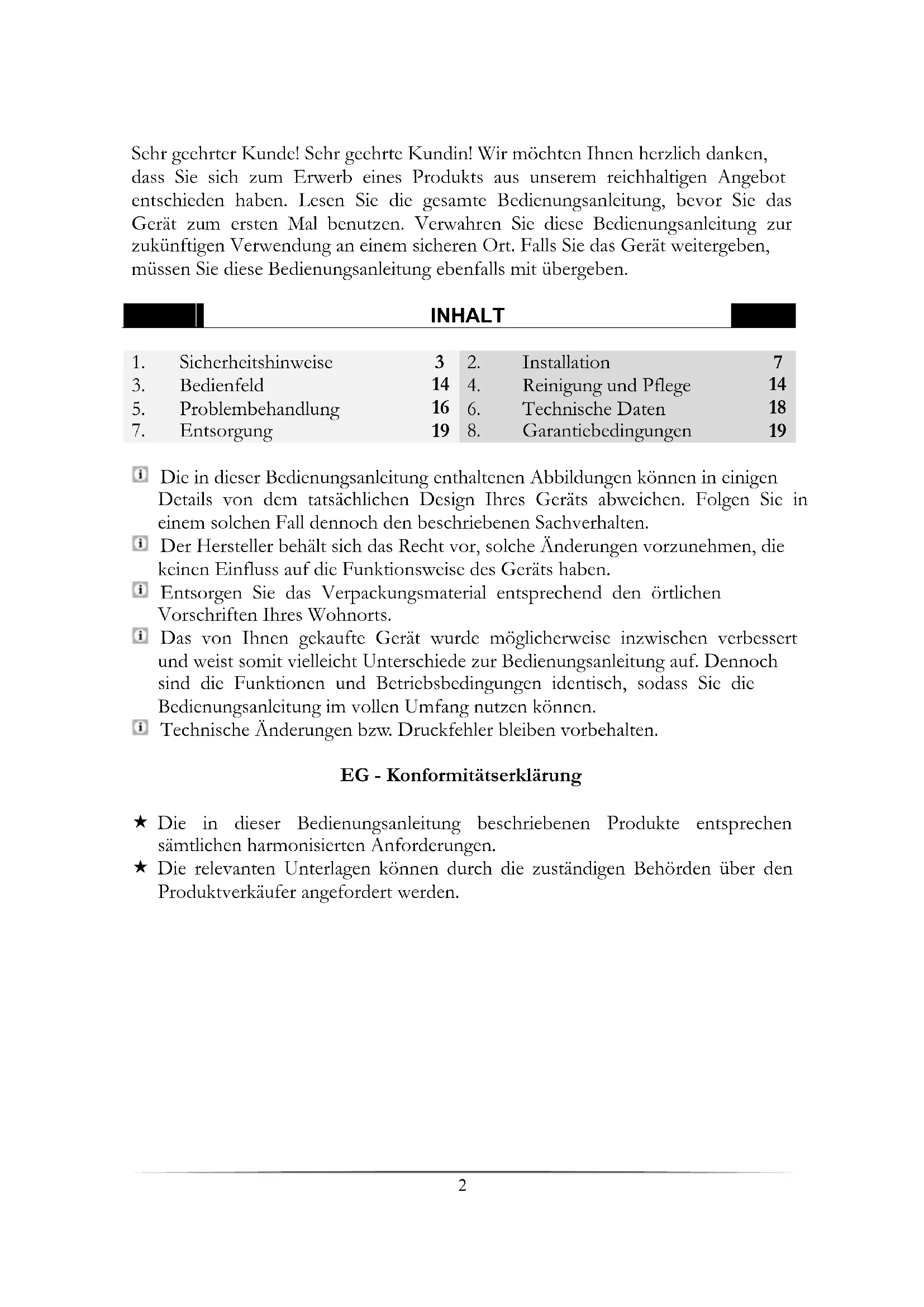 Die in dieser Bedienungsanleitung enthaltenen Abbildungen können in einigen Details von dem tatsächlichen Design Ihres Geräts abweichen. Folgen Sie in einem solchen Fall dennoch den beschriebenen Sachverhalten. Der Hersteller behält sich das Recht vor, solche Änderungen vorzunehmen, die keinen Einfluss auf die Funktionsweise des Geräts haben. Entsorgen Sie das Verpackungsmaterial entsprechend den örtlichen Vorschriften Ihres Wohnorts. Das von Ihnen gekaufte Gerät wurde möglicherweise inzwischen verbessert und weist somit vielleicht Unterschiede zur Bedienungsanleitung auf. Dennoch sind die Funktionen und Betriebsbedingungen identisch, sodass Sie die Bedienungsanleitung im vollen Umfang nutzen können. Technische Änderungen bzw. Druckfehler bleiben vorbehalten. EG - Konformitätserklärung Die in dieser Bedienungsanleitung beschriebenen Produkte entsprechen sämtlichen harmonisierten Anforderungen. Die relevanten Unterlagen können durch die zuständigen Behörden über den Produktverkäufer angefordert werden.3