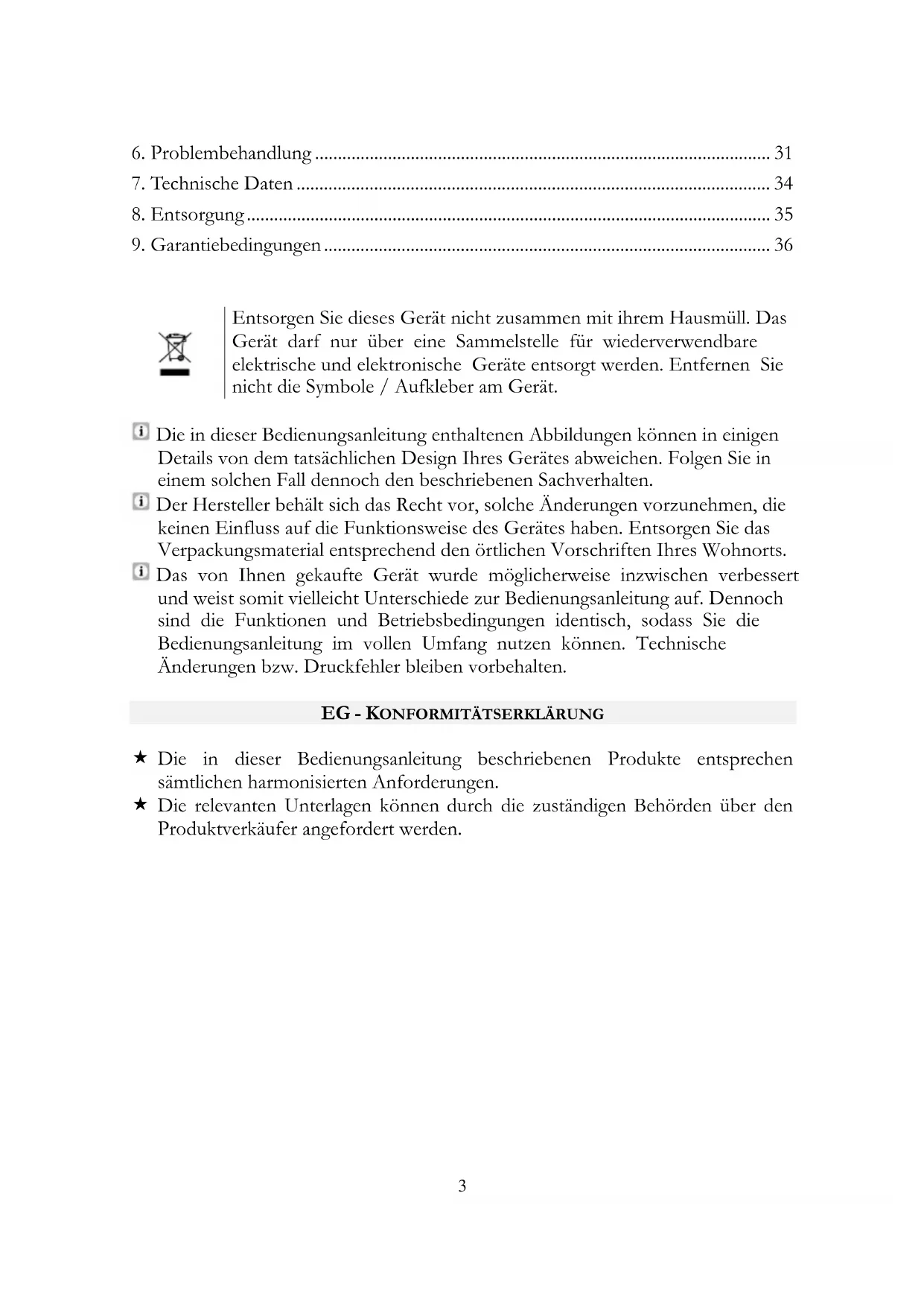 Die in dieser Bedienungsanleitung enthaltenen Abbildungen können in einigen Details von dem tatsächlichen Design Ihres Gerätes abweichen. Folgen Sie in einem solchen Fall dennoch den beschriebenen Sachverhalten. Der Hersteller behält sich das Recht vor, solche Änderungen vorzunehmen, die keinen Einfluss auf die Funktionsweise des Gerätes haben. Entsorgen Sie das Verpackungsmaterial entsprechend den örtlichen Vorschriften Ihres Wohnorts. Das von Ihnen gekaufte Gerät wurde möglicherweise inzwischen verbessert und weist somit vielleicht Unterschiede zur Bedienungsanleitung auf. Dennoch sind die Funktionen und Betriebsbedingungen identisch, sodass Sie die Bedienungsanleitung im vollen Umfang nutzen können. Technische Änderungen bzw. Druckfehler bleiben vorbehalten.