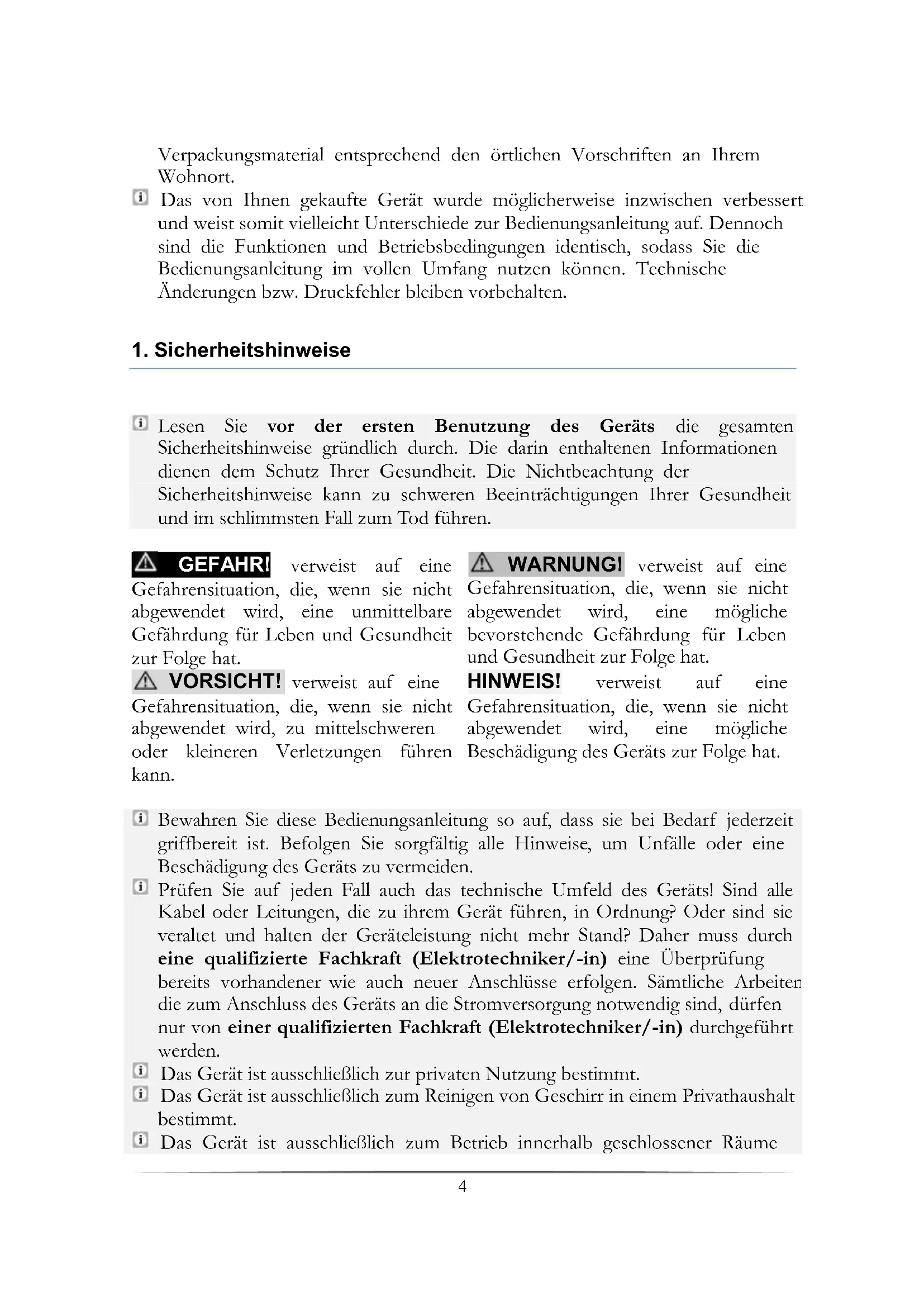 Bewahren Sie diese Bedienungsanleitung so auf, dass sie bei Bedarf jederzeit griffbereit ist. Befolgen Sie sorgfältig alle Hinweise, um Unfälle oder eine Beschädigung des Geräts zu vermeiden. Prüfen Sie auf jeden Fall auch das technische Umfeld des Geräts! Sind alle Kabel oder Leitungen, die zu ihrem Gerät führen, in Ordnung? Oder sind sie veraltet und halten der Geräteleistung nicht mehr Stand? Daher muss durch eine qualifizierte Fachkraft (Elektrotechniker/-in) eine Überprüfung bereits vorhandener wie auch neuer Anschlüsse erfolgen. Sämtliche Arbeiten, die zum Anschluss des Geräts an die Stromversorgung notwendig sind, dürfen nur von einer qualifizierten Fachkraft (Elektrotechniker/-in) durchgeführt werden. Das Gerät ist ausschließlich zur privaten Nutzung bestimmt. Das Gerät ist ausschließlich zum Reinigen von Geschirr in einem Privathaushalt bestimmt. Das Gerät ist ausschließlich zum Betrieb innerhalb geschlossener Räume5 bestimmt. Dieses Gerät darf nicht für gewerbliche Zwecke, beim Camping und in öffentlichen Verkehrsmitteln betrieben werden. Betreiben Sie das Gerät ausschließlich im Sinne seiner bestimmungsgemäßen Verwendung. Erlauben Sie niemandem, der mit der Bedienungsanleitung nicht vertraut ist, das Gerät zu benutzen. Dieses Gerät kann von Kindern ab 8 Jahren und darüber sowie von Personen mit verringerten physischen, sensorischen oder mentalen Fähigkeiten oder Mangel an Erfahrung und Wissen benutzt werden, wenn sie beaufsichtigt oder bezüglich des sicheren Gebrauchs des Gerätes unterwiesen wurden und die daraus resultierenden Gefahren verstehen. Kinder dürfen nicht mit dem Gerät spielen. Reinigung und Benutzer-Wartung dürfen nicht von Kindern ohne Beaufsichtigung durchgeführt werden.