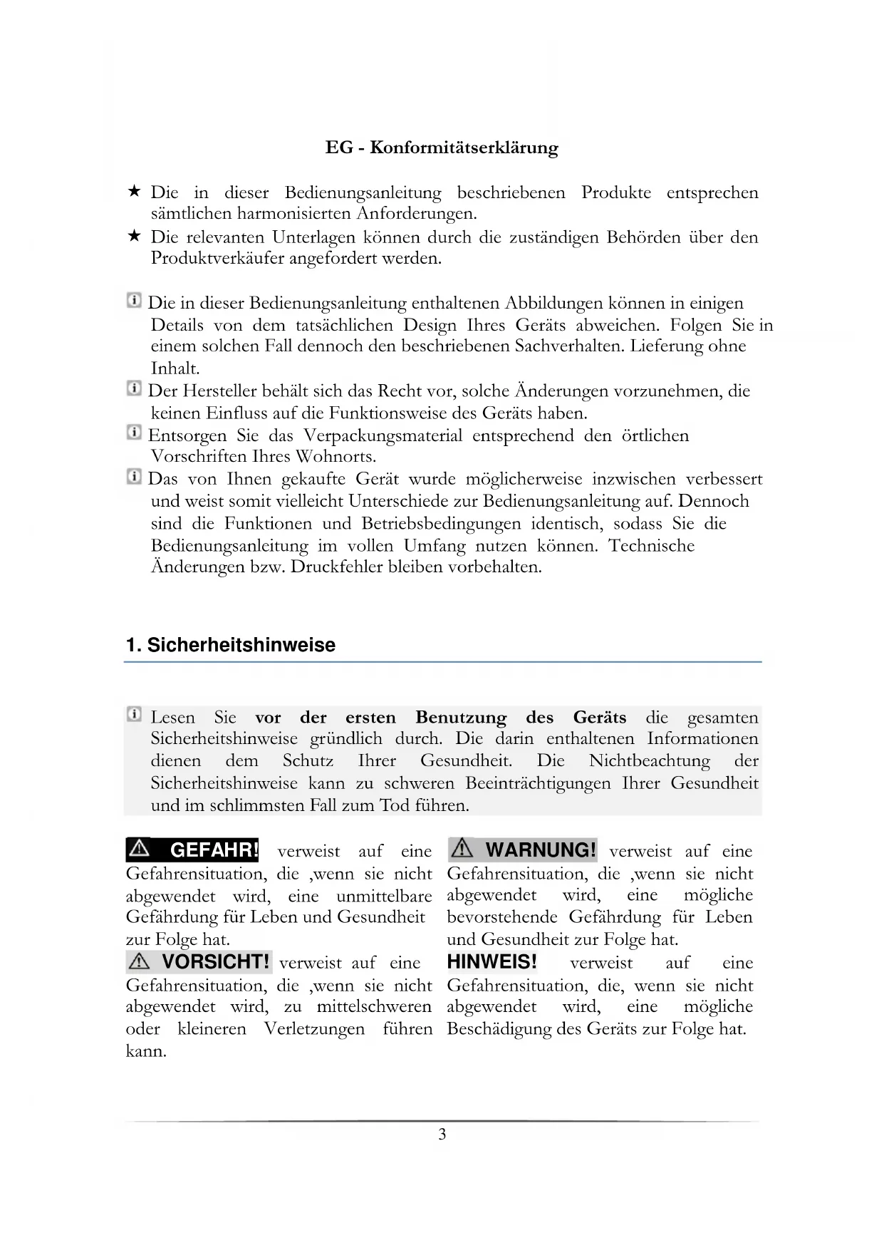 i Lesen Sie vor der ersten Benutzung des Geräts die gesamten Sicherheitshinweise gründlich durch. Die darin enthaltenen Informationen dieren dem Schutz Ihrer Gesundheit. Die Nichtbeachtung der Sicherheitshinweisc kann zu schweren Beeinträchtigungen Ihrer Gesundheit und im schlimmsten Fall zum Tod führen.