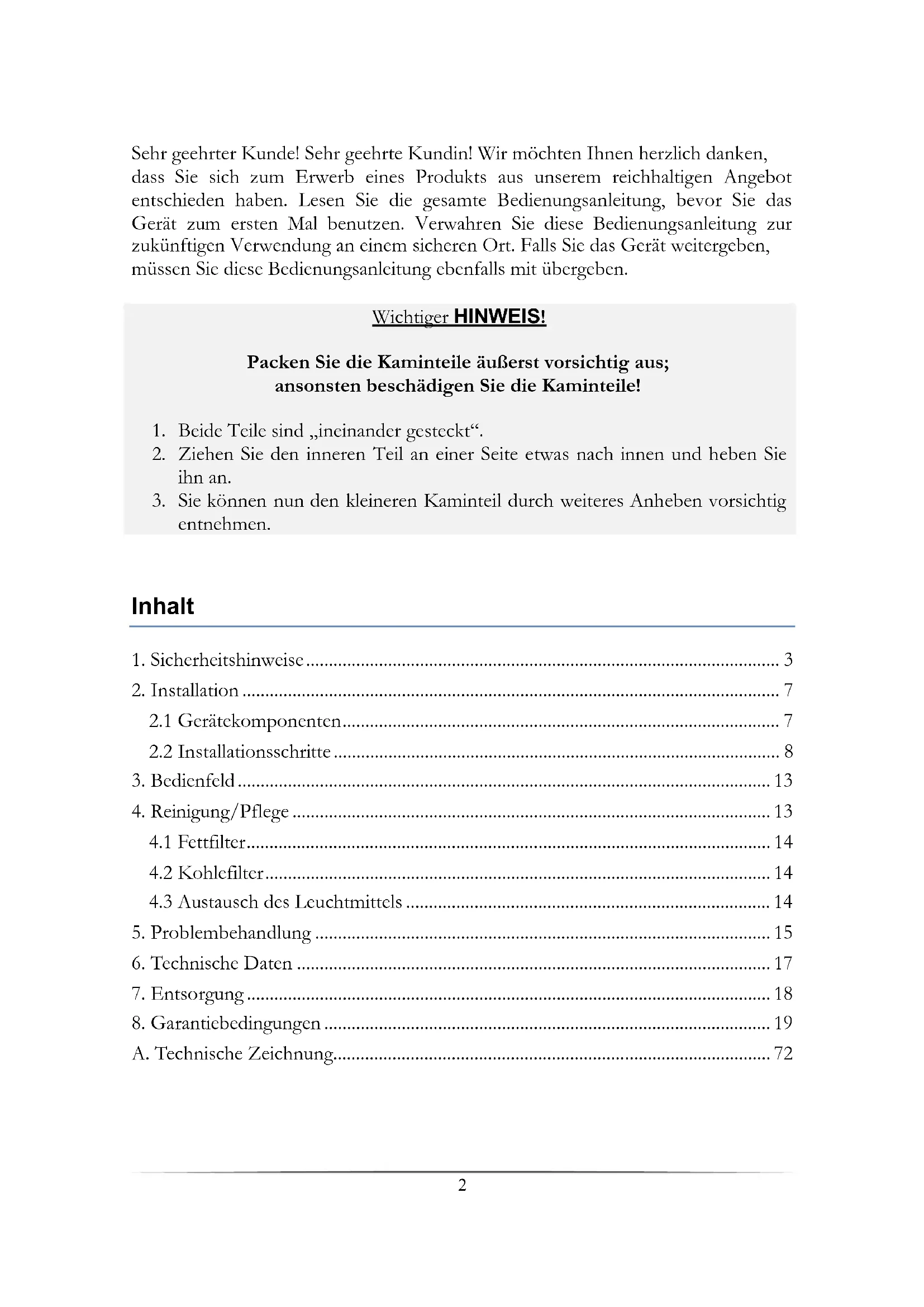 nicht abschließend bei Brand oder Explosion. Garantieleistungen bewirken weder eine Verlängerung der Garantiefrist noch setzen sie eine neue Garantiefrist in Lauf. Der räumliche Geltungsbereich der Garantie erstreckt sich auf in Deutschland, Österreich, Belgien, Luxemburg und in den Niederlanden gekaufte und verwendete Geräte. August 201420 Dear customer! We would like to thank you for purchasing a product from our wide range of domestic appliances. Read the complete instruction manual before you operate the appliance for the first time. Retain this instruction manual in a safe place for future reference. If you transfer the appliance to a third party, also hand over this instruction manual. Important NOTICE! Unpack the parts of the chimney very carefully; otherwise you will damage the chimney!