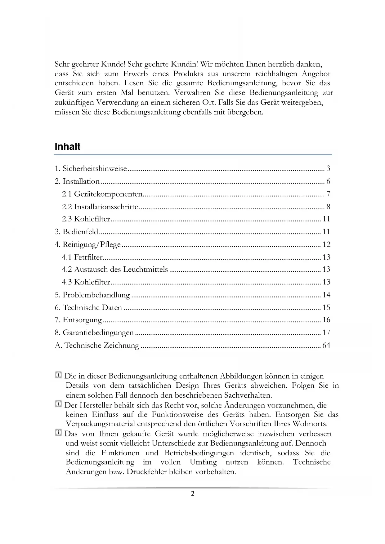 Bewahren Sie diese Bedienungsanleitung so auf, dass sie bei Bedarf jederzeit griffbereit ist. Befolgen Sie sorgfältig alle Hinweise, um Unfälle oder eine Beschädigung des Geräts zu vermeiden. Prüfen Sie auf jeden Fall auch das technische Umfeld des Geräts! Sind alle Kabel oder Leitungen, die zu ihrem Gerät führen, in Ordnung? Oder sind sie veraltet und halten der Geräteleistung nicht mehr Stand? Daher muss durch eine qualifizierte Fachkraft (Elektrotechniker/-in) eine Überprüfung bereits vorhandener wie auch neuer Anschlüsse erfolgen. Sämtliche Arbeiten, die zum Anschluss des Geräts an die Stromversorgung notwendig sind, dürfen nur von einer qualifizierten Fachkraft (Elektrotechniker/-in) durchgeführt werden. Das Gerät ist ausschließlich zur privaten Nutzung bestimmt. Das Gerät ist ausschließlich zum Abführen von Küchendämpfen in einem Privathaushalt bestimmt. Das Gerät ist ausschließlich zum Betrieb innerhalb geschlossener Räume4 bestimmt. Dieses Gerät darf nicht für gewerbliche Zwecke, beim Camping und in öffentlichen Verkehrsmitteln betrieben werden. Betreiben Sie das Gerät ausschließlich im Sinne seiner bestimmungsgemäßen Verwendung. Erlauben Sie niemandem, der mit der Bedienungsanleitung nicht vertraut ist, das Gerät zu benutzen.