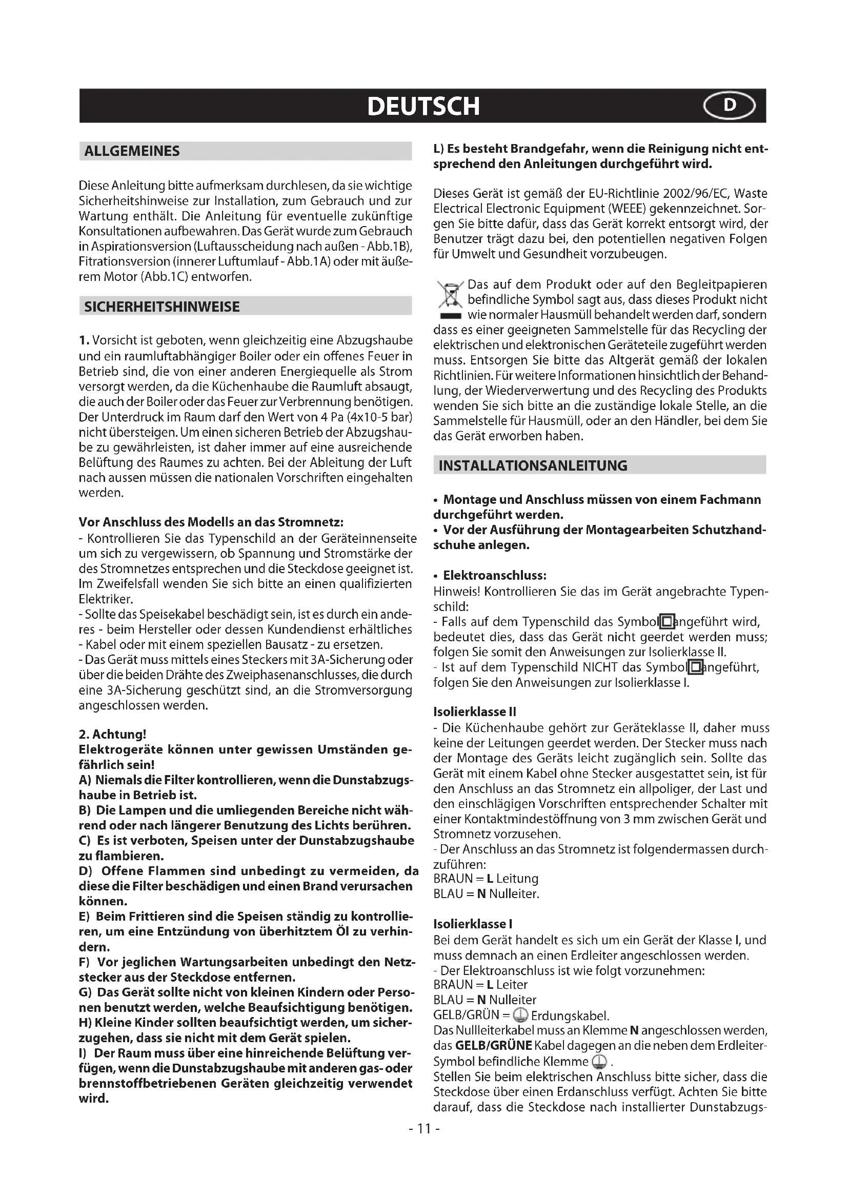 - Elektroanschluss: Hinweis! Kontrollieren Sie das im Gerät angebrachte Typen- schild: - Falls auf dem Typenschild das Symbol angeführt wird, bedeutet dies, dass das Gerät nicht geerdet werden muss; folgen Sie somit den Anweisungen zur Isolierklasse II. - Ist auf dem Typenschild NICHT das Symbol angeführt, folgen Sie den Anweisungen zur Isolierklasse I. Isolierklasse II - Die Küchenhaube gehört zur Geräteklasse II, daher muss keine der Leitungen geerdet werden. Der Stecker muss nach der Montage des Geräts leicht zugänglich sein. Sollte das Gerät mit einem Kabel ohne Stecker ausgestattet sein, ist für den Anschluss an das Stromnetz ein allpoliger, der Last und den einschlägigen Vorschriften entsprechender Schalter mit einer Kontaktmindestöffnung von 3 mm zwischen Gerät und Stromnetz vorzusehen. - Der Anschluss an das Stromnetz ist folgendermassen durch- zuführen: BRAUN = L Leitung BLAU = N Nulleiter. Isolierklasse I Bei dem Gerät handelt es sich um ein Gerät der Klasse I, und muss demnach an einen Erdleiter angeschlossen werden. - Der Elektroanschluss ist wie folgt vorzunehmen: BRAUN = L Leiter BLAU = N Nulleiter