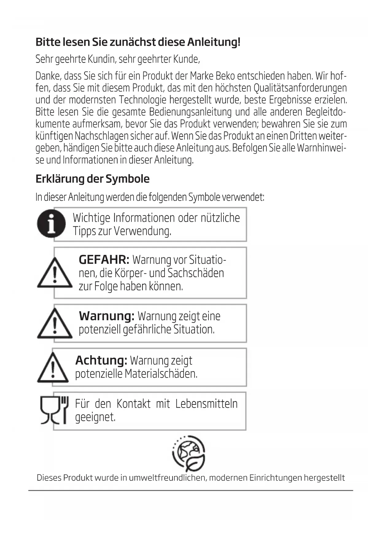 TroubleshootngBitte lesen Sie zunächst diese Anleitung! Sehr geehrte Kundin, sehr geehrter Kunde, Danke, dass Sie sich für ein Produkt der Marke Beko entschieden haben. Wir hof- fen, dass Sie mit diesem Produkt, das mit den höchsten Qualitätsanforderungen und der modernsten Technologie hergestellt wurde, beste Ergebnisse erzielen. Bitte lesen Sie die gesamte Bedienungsanleitung und alle anderen Begleitdo- kumente aufmerksam, bevor Sie das Produkt verwenden; bewahren Sie sie zum künftigen Nachschlagen sicher auf. Wenn Sie das Produkt an einen Dritten weiter- geben, händigen Sie bitte auch diese Anleitung aus. Befolgen Sie alle Warnhinwei- se und Informationen in dieser Anleitung. Erklärung der Symbole In dieser Anleitung werden die folgenden Symbole verwendet: Wchtge Informatonen oder nützlche Tpps zur Verwendung. GEFAHR: Warnung vor Stuato- nen, de Körper- und Sachschäden zur Folge haben können. Warnung: Warnung zegt ene potenzell gefährlche Stuaton. Achtung: Warnung zegt potenzelle Materalschäden. Für den Kontakt mt Lebensmtteln geegnet. Deses Produkt wurde n umweltfreundlchen, modernen Enrchtungen hergestellt1. Externe Tropfschale