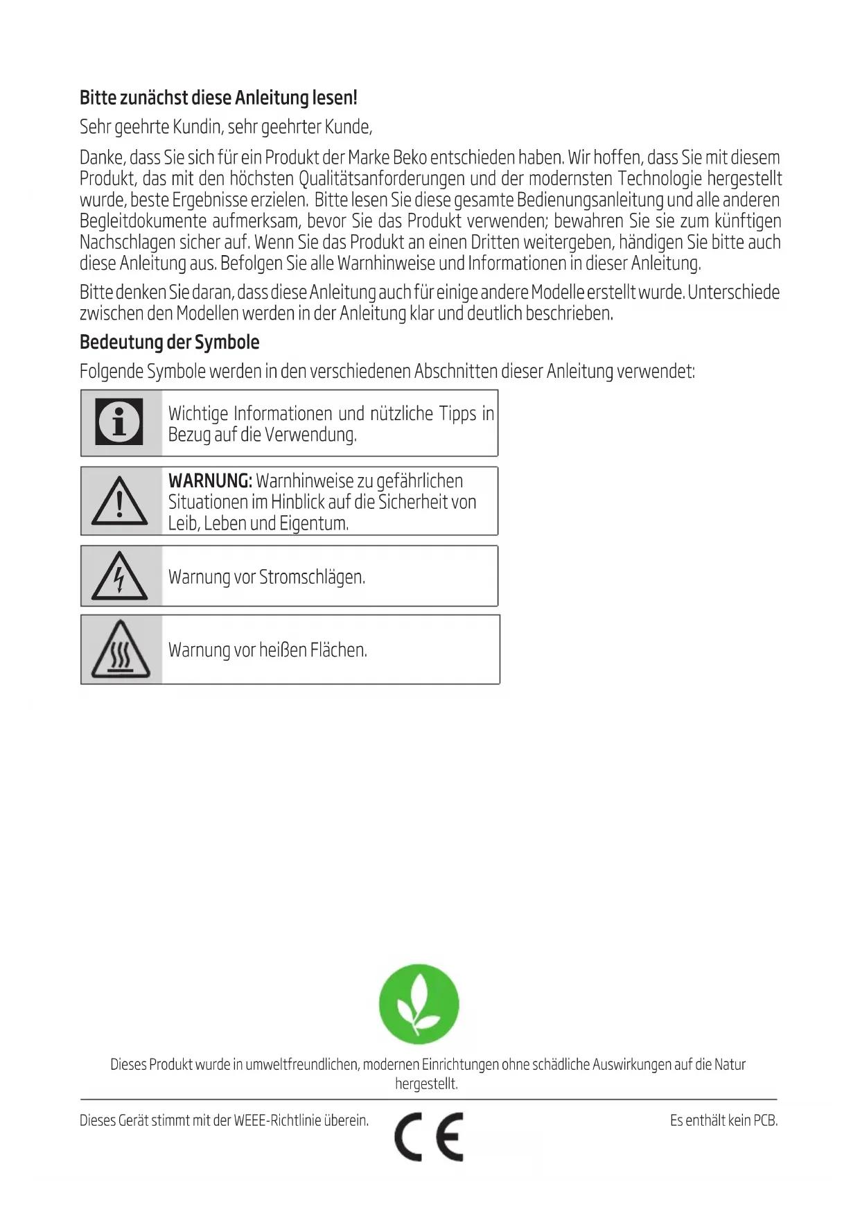 Contact Authorized Service Agent for lamp replacement.Dieses Produkt wurde in umweltfreundlichen, modernen Einrichtungen ohne schädliche Auswirkungen auf die Natur hergestellt. Dieses Gerät stimmt mit der WEEE-Richtlinie überein. Es enthält kein PCB. Bitte zunächst diese Anleitung lesen! Sehr geehrte Kundin, sehr geehrter Kunde, Danke, dass Sie sich für ein Produkt der Marke Beko entschieden haben. Wir hoffen, dass Sie mit diesem Produkt, das mit den höchsten Qualitätsanforderungen und der modernsten Technologie hergestellt wurde, beste Ergebnisse erzielen. Bitte lesen Sie diese gesamte Bedienungsanleitung und alle anderen Begleitdokumente aufmerksam, bevor Sie das Produkt verwenden; bewahren Sie sie zum künftigen Nachschlagen sicher auf. Wenn Sie das Produkt an einen Dritten weitergeben, händigen Sie bitte auch diese Anleitung aus. Befolgen Sie alle Warnhinweise und Informationen in dieser Anleitung. Bitte denken Sie daran, dass diese Anleitung auch für einige andere Modelle erstellt wurde. Unterschiede zwischen den Modellen werden in der Anleitung klar und deutlich beschrieben. Bedeutung der Symbole Folgende Symbole werden in den verschiedenen Abschnitten dieser Anleitung verwendet: