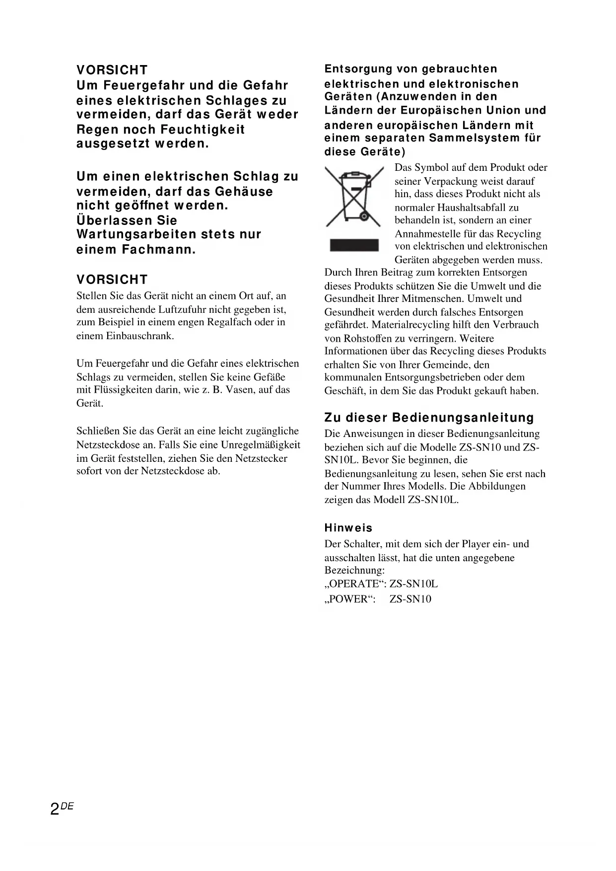 VORSICHT Um Feuergefahr und die Gefahr eines elektrischen Schlages zu vermeiden, darf das Gerät weder Regen noch Feuchtigkeit ausgesetzt werden. Um einen elektrischen Schlag zu vermeiden, darf das Gehäuse nicht geöffnet werden. Überlassen Sie Wartungsarbeiten stets nur einem Fachmann. VORSICHT Stellen Sie das Gerät nicht an einem Ort auf, an dem ausreichende Luftzufuhr nicht gegeben ist, zum Beispiel in einem engen Regalfach oder in einem Einbauschrank. Um Feuergefahr und die Gefahr eines elektrischen Schlags zu vermeiden, stellen Sie keine Gefäße mit Flüssigkeiten darin, wie z. B. Vasen, auf das Gerät. Schließen Sie das Gerät an eine leicht zugängliche Netzsteckdose an. Falls Sie eine Unregelmäßigkeit im Gerät feststellen, ziehen Sie den Netzstecker sofort von der Netzsteckdose ab. Entsorgung von gebrauchten elektrischen und elektronischen Geräten (Anzuwenden in den Ländern der Europäischen Union und anderen europäischen Ländern mit einem separaten Sammelsystem für diese Geräte) Das Symbol auf dem Produkt oder seiner Verpackung weist darauf hin, dass dieses Produkt nicht als normaler Haushaltsabfall zu behandeln ist, sondern an einer Annahmestelle für das Recycling von elektrischen und elektronischen Geräten abgegeben werden muss. Durch Ihren Beitrag zum korrekten Entsorgen dieses Produkts schützen Sie die Umwelt und die Gesundheit Ihrer Mitmenschen. Umwelt und Gesundheit werden durch falsches Entsorgen gefährdet. Materialrecycling hilft den Verbrauch von Rohstoffen zu verringern. Weitere Informationen über das Recycling dieses Produkts erhalten Sie von Ihrer Gemeinde, den kommunalen Entsorgungsbetrieben oder dem Geschäft, in dem Sie das Produkt gekauft haben. Zu dieser Bedienungsanleitung Die Anweisungen in dieser Bedienungsanleitung beziehen sich auf die Modelle ZS-SN10 und ZS- SN10L. Bevor Sie beginnen, die Bedienungsanleitung zu lesen, sehen Sie erst nach der Nummer Ihres Modells. Die Abbildungen zeigen das Modell ZS-SN10L. Hinweis Der Schalter, mit dem sich der Player ein- und ausschalten lässt, hat die unten angegebene Bezeichnung: