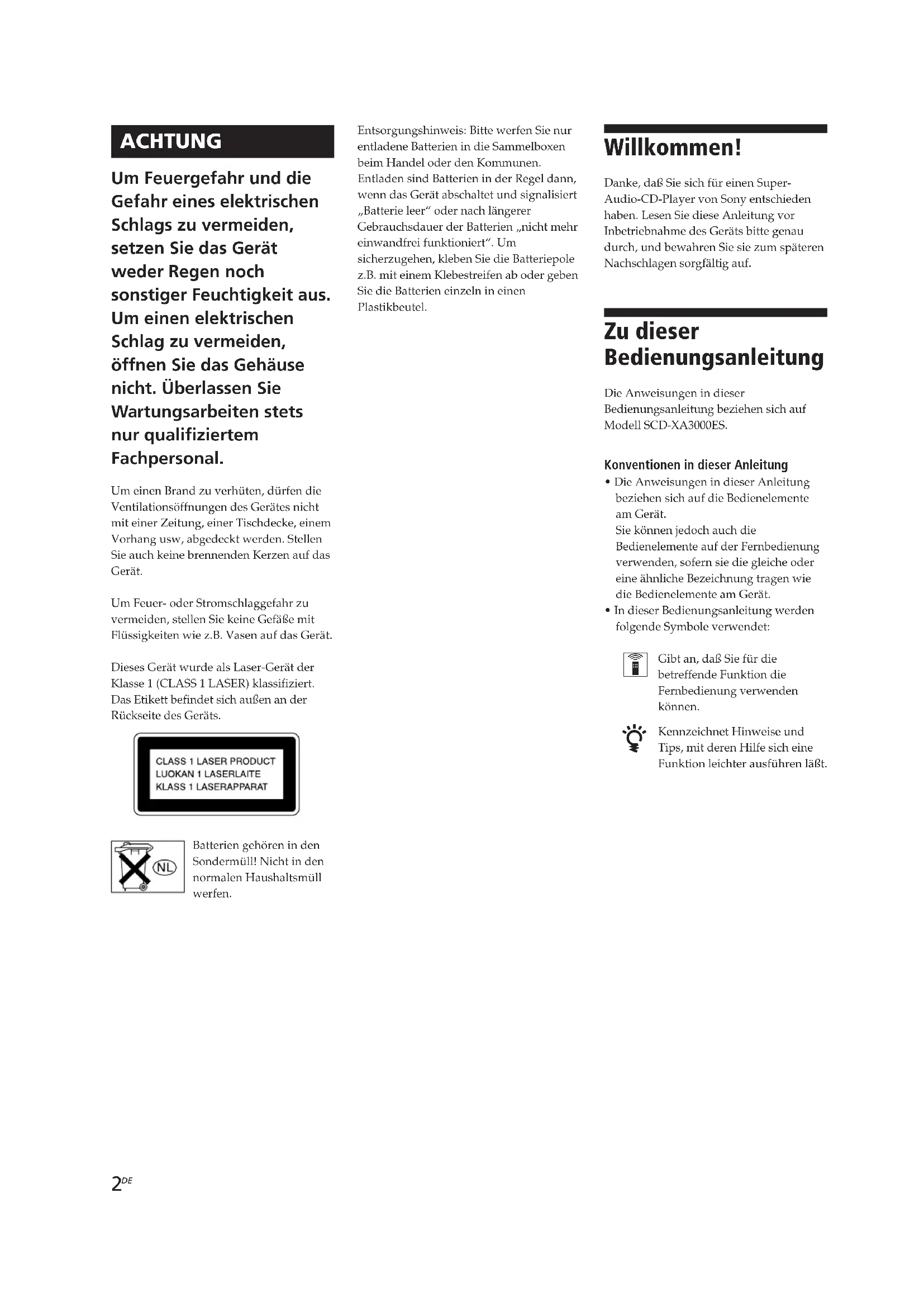 ACHTUNG Um Feuergefahr und die Gefahr eines elektrischen Schlags zu vermeiden, setzen Sie das Gerät weder Regen noch sonstiger Feuchtigkeit aus. Um einen elektrischen Schlag zu vermeiden, öffnen Sie das Gehäuse nicht. Überlassen Sie Wartungsarbeiten stets nur qualifiziertem Fachpersonal. Willkommen! Danke, daß Sie sich für einen Super- Audio-CD-Player von Sony entschieden haben. Lesen Sie diese Anleitung vor Inbetriebnahme des Geräts bitte genau durch, und bewahren Sie sie zum späteren Nachschlagen sorgfältig auf. Zu dieser Bedienungsanleitung Die Anweisungen in dieser Bedienungsanleitung beziehen sich auf Modell SCD-XA3000ES. Konventionen in dieser Anleitung