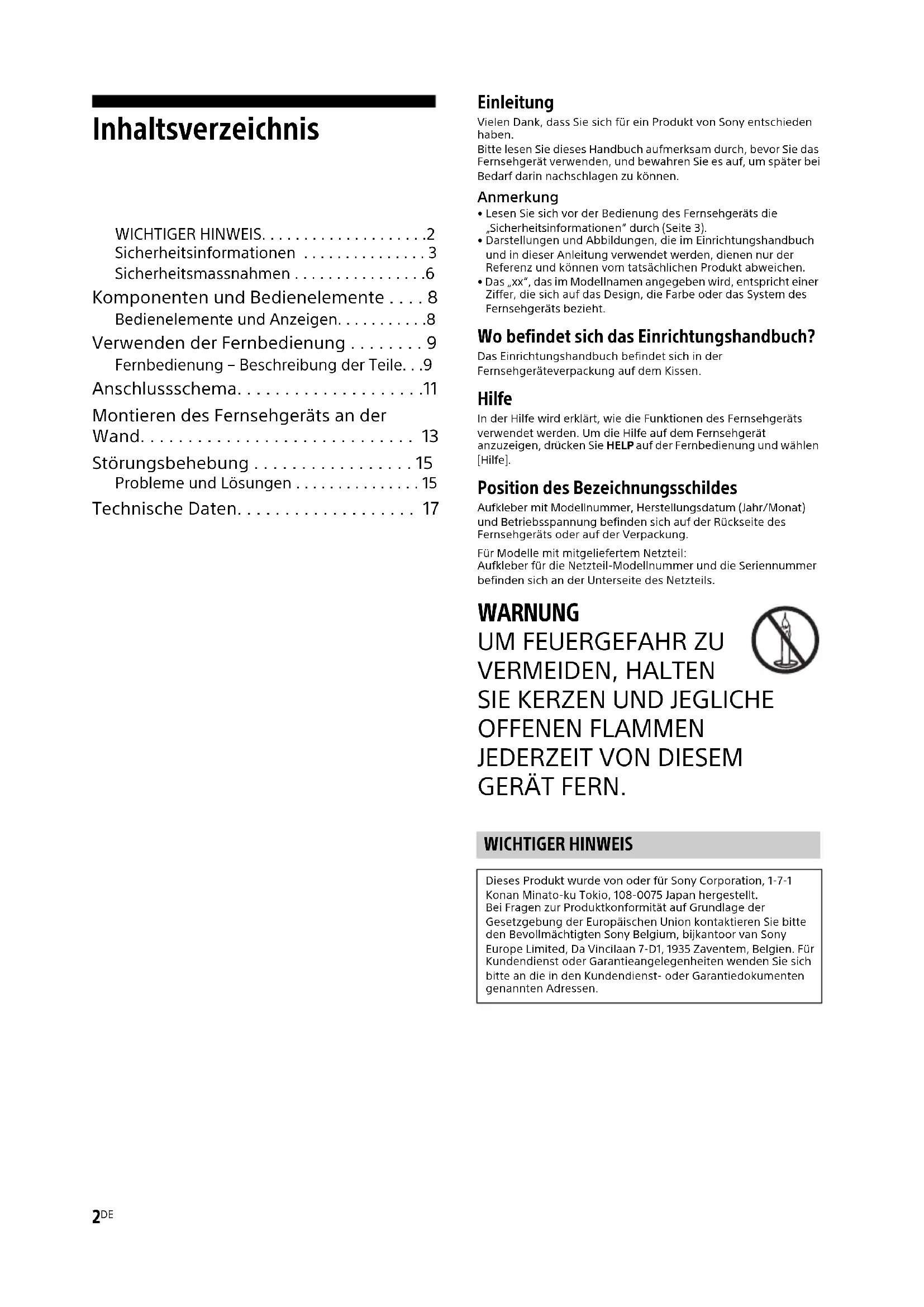 - Technische Daten Einleitung Vielen Dank, dass Sie sich für ein Produkt von Sony entschieden haben. Bitte lesen Sie dieses Handbuch aufmerksam durch, bevor Sie das Fernsehgerät verwenden, und bewahren Sie es auf, um später bei Bedarf darin nachschlagen zu können.Anmerkung• Lesen Sie sich vor der Bedienung des Fernsehgeräts die p. 17