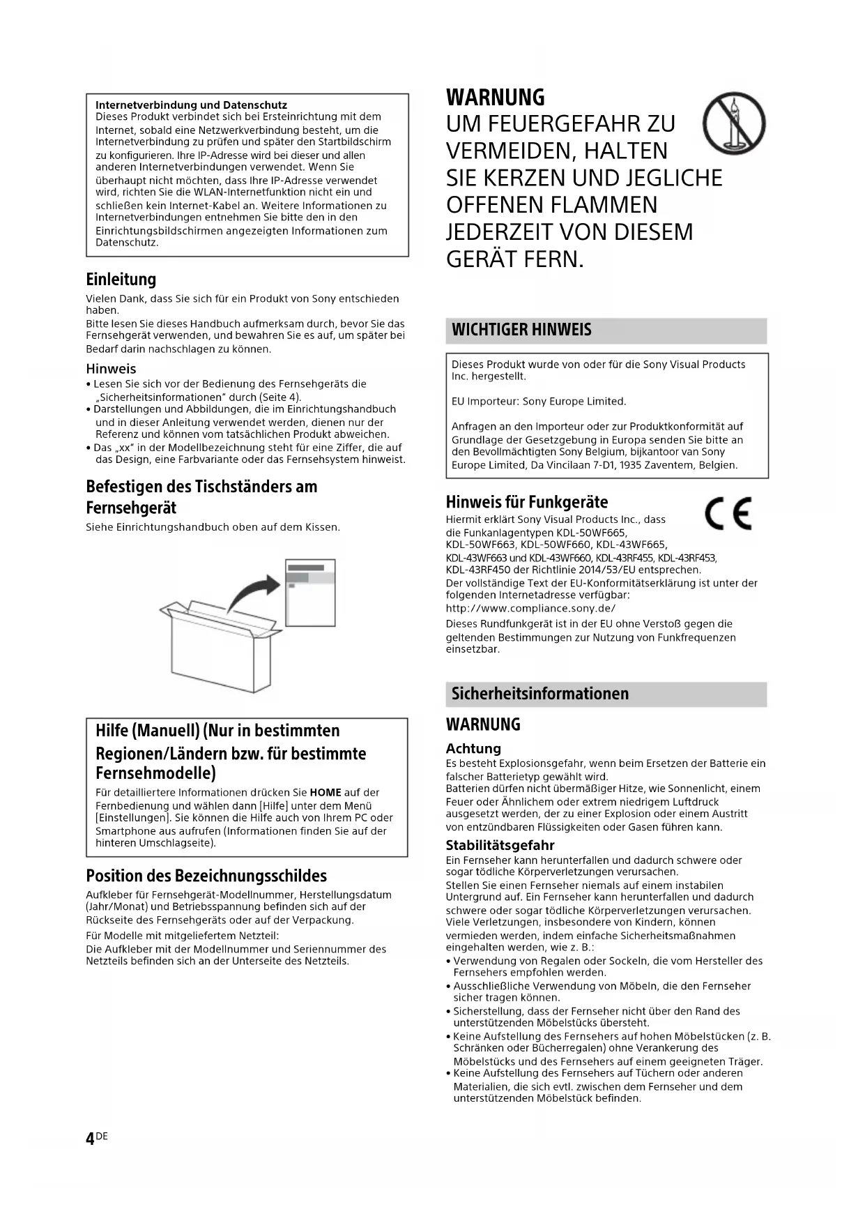 GERÄT FERN. Hinweis für Funkgeräte Hiermit erklärt Sony Visual Products Inc., dass die Funkanlagentypen KDL-50WF665, KDL-50WF663, KDL-50WF660, KDL-43WF665, KDL-43WF663 und KDL-43WF660, KDL-43RF455, KDL-43RF453, KDL-43RF450 der Richtlinie 2014/53/EU entsprechen. Der vollständige Text der EU-Konformitätserklärung ist unter der folgenden Internetadresse verfügbar: http://www.compliance.sony.de/ Dieses Rundfunkgerät ist in der EU ohne Verstoß gegen die geltenden Bestimmungen zur Nutzung von Funkfrequenzen einsetzbar. WARNUNG Achtung Es besteht Explosionsgefahr, wenn beim Ersetzen der Batterie ein falscher Batterietyp gewählt wird. Batterien dürfen nicht übermäßiger Hitze, wie Sonnenlicht, einem Feuer oder Ähnlichem oder extrem niedrigem Luftdruck ausgesetzt werden, der zu einer Explosion oder einem Austritt von entzündbaren Flüssigkeiten oder Gasen führen kann. Stabilitätsgefahr Ein Fernseher kann herunterfallen und dadurch schwere oder sogar tödliche Körperverletzungen verursachen. Stellen Sie einen Fernseher niemals auf einem instabilen Untergrund auf. Ein Fernseher kann herunterfallen und dadurch schwere oder sogar tödliche Körperverletzungen verursachen. Viele Verletzungen, insbesondere von Kindern, können vermieden werden, indem einfache Sicherheitsmaßnahmen eingehalten werden, wie z. B.: