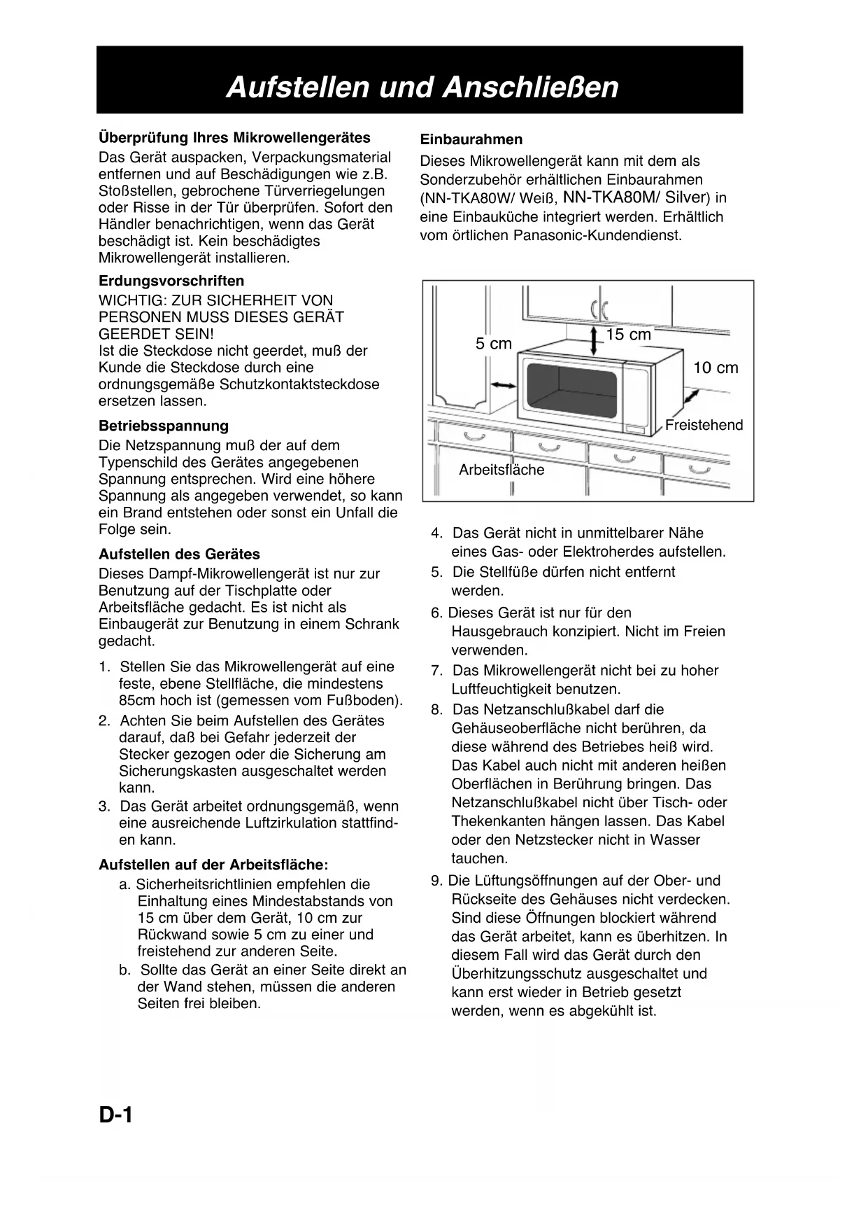 Rückseite des Gehäuses nicht verdecken. Sind diese Öffnungen blockiert während das Gerät arbeitet, kann es überhitzen. In diesem Fall wird das Gerät durch den Überhitzungsschutz ausgeschaltet und kann erst wieder in Betrieb gesetzt werden, wenn es abgekühlt ist. Einbaurahmen Dieses Mikrowellengerät kann mit dem als Sonderzubehör erhältlichen Einbaurahmen (NN-TKA80W/ Weiß, NN-TKA80M/ Silver) in eine Einbauküche integriert werden. Erhältlich vom örtlichen Panasonic-Kundendienst.D-2 Deutsch WARNUNG