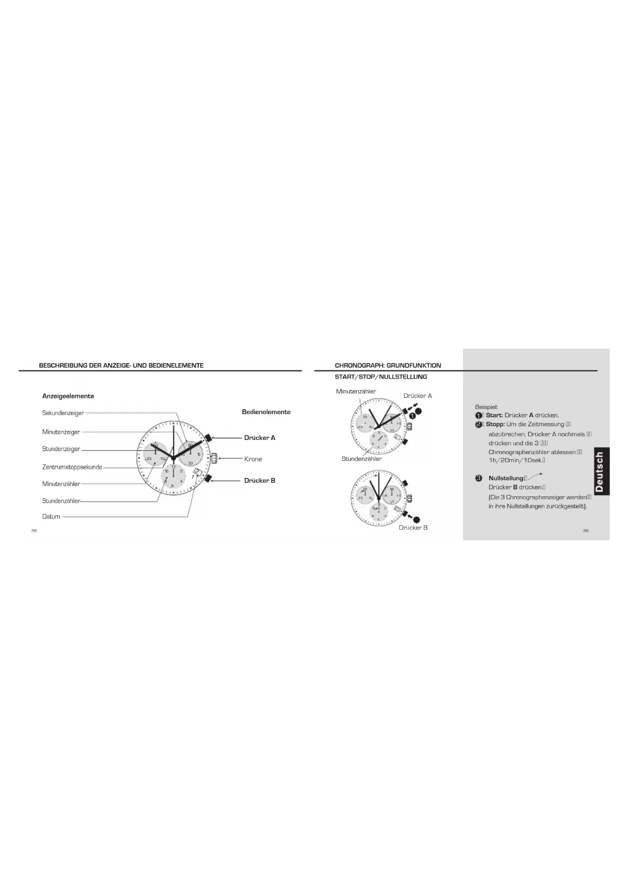 Anzeigeelemente Sekundenzeiger Minutenzeiger Stundenzeiger Zentrumstoppsekunde Minutenzähler Stundenzähler Datum Bedienelemente Drücker A Krane Drücker B30