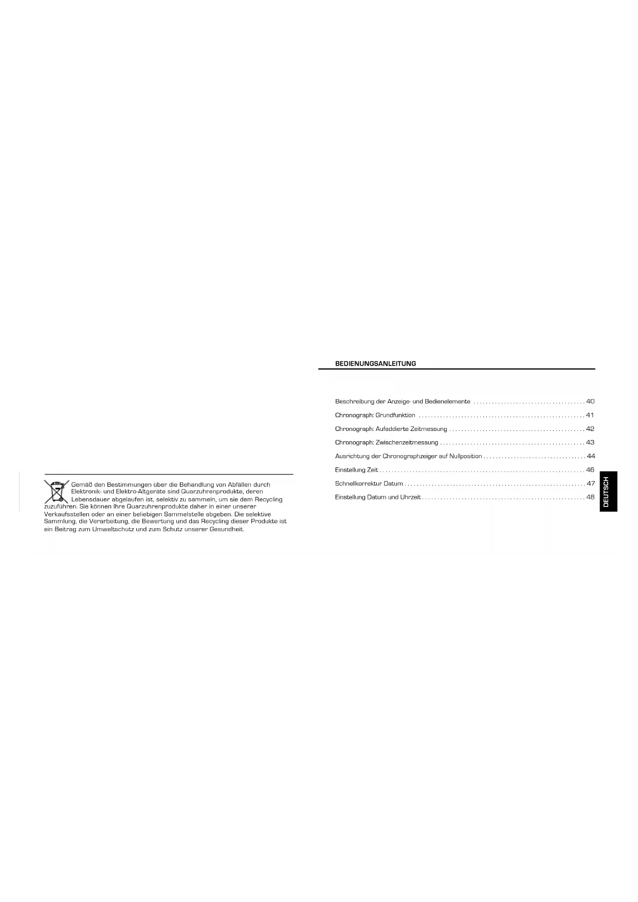 - Tirer la couronne en pos. II (la montre continue de fonctionner). **Tourner la couronne jusqu’à ce que la veille de la date actuelle apparaisse (3). Tourner la couronne jusqu’à ce que la date actuelle apparaisse. **Continuer de tourner la couronne jusqu’à ce que l’heure actuelle 20:30 soit affichée. Repousser la couronne en position I. *Tirer la couronne en position III (l’aiguille des secondes s’immobilise). Aiguille des secondesDEutsCh Gemäß den Bestimmungen über die Behandlung von Abfällen durch Elektronik- und Elektro-Altgeräte sind Quarzuhrenprodukte, deren Lebensdauer abgelaufen ist, selektiv zu sammeln, um sie dem Recycling zuzuführen. Sie können Ihre Quarzuhrenprodukte daher in einer unserer Verkaufsstellen oder an einer beliebigen Sammelstelle abgeben. Die selektive Sammlung, die Verarbeitung, die Bewertung und das Recycling dieser Produkte ist ein Beitrag zum Umweltschutz und zum Schutz unserer Gesundheit. Beschreibung der Anzeige- und Bedienelemente .....................................40 Chronograph: Grundfunktion .......................................................41 Chronograph: Aufaddierte Zeitmessung .............................................42 Chronograph: Zwischenzeitmessung ................................................43 Ausrichtung der Chronographzeiger auf Nullposition ..................................44 Einstellung Zeit . . . . . . . . . . . . . . . . . . . . . . . . . . . . . . . . . . . . . . . . . . . . . . . . . . . . . . . . . . . . . . . . . . . . 46 Schnellkorrektur Datum ............................................................47 Einstellung Datum und Uhrzeit ......................................................48 bEDIEnungsanlEItung4140