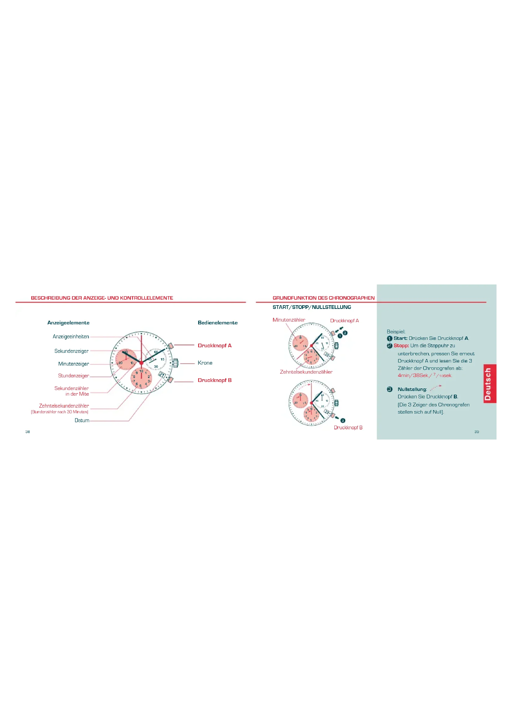 Stopp:Um die Stoppahr zu unterbrechen,pressen Sie erneut Druckknopf A und lessen Die 3 Zahler der Chronografen ab: 4min/38Sek./10sek.
