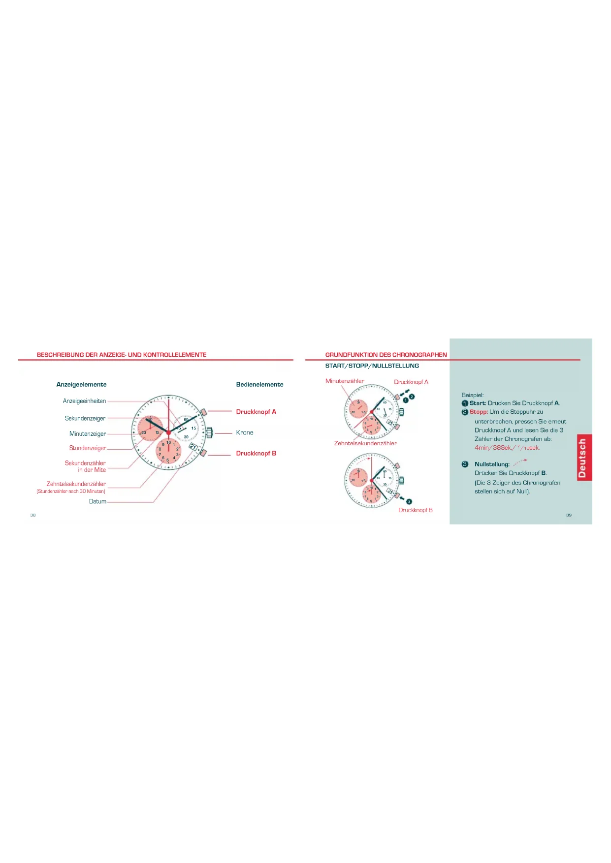 Beispiel: Start: Drücken Sie Druckknopf A. Stopp: Um die Stoppuhr zu unterbrechen, pressen Sie erneut Druckknopf A und lesen Sie die 3 Zähler der Chronografen ab: 4min/38Sek./