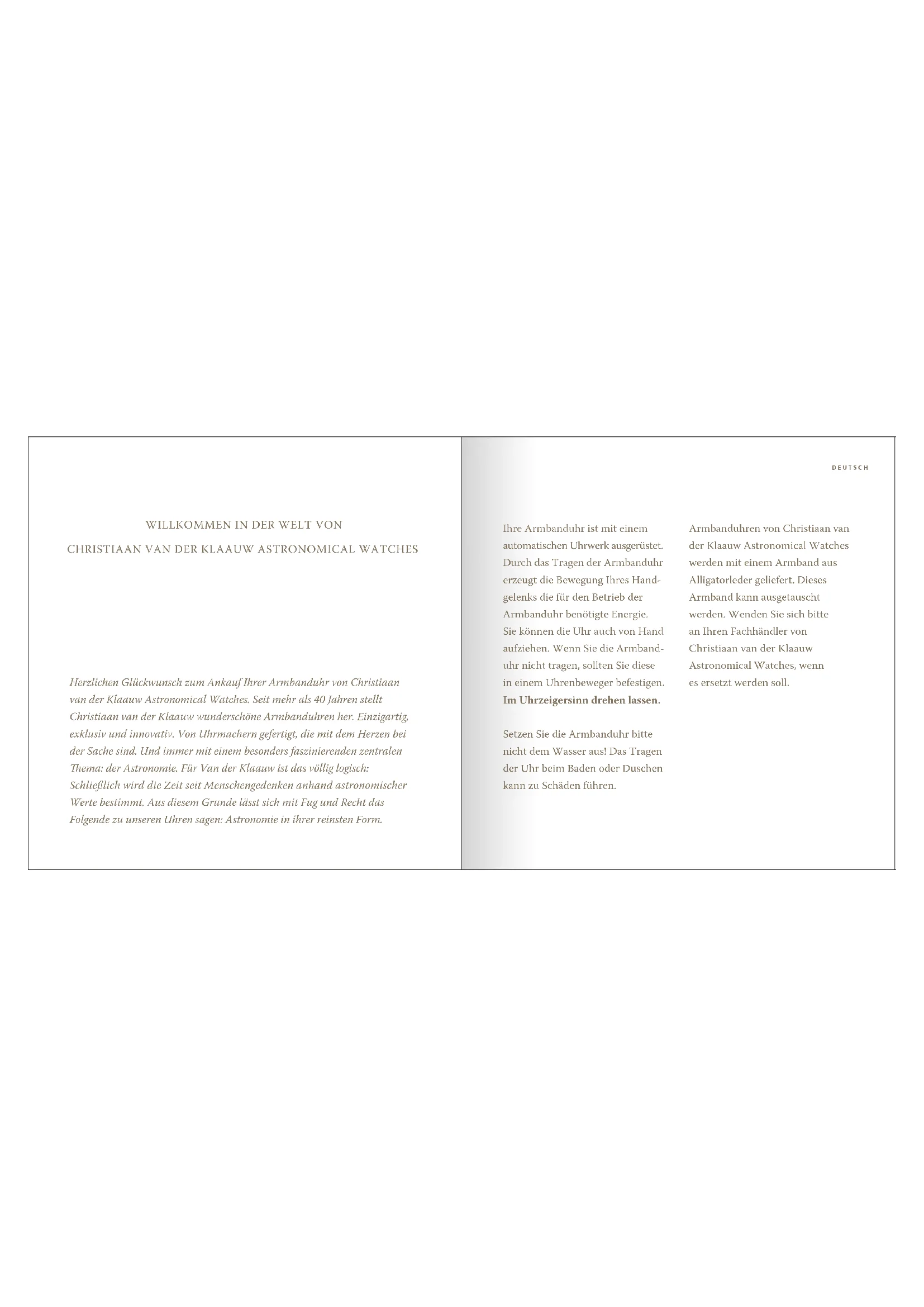 La phase de la lune est indiquée en bas du cadran. Lorsque la lune est achée à gauche du centre, elle est dans son premier quartier. Lorsque l’image de la lune est au centre, c’est la pleine lune, et quand elle est à droite, elle est dans son dernier quartier. Si l’image de la lune n’est pas visible, c’est la nouvelle lune. FRANÇAISFRANÇAISHerzlichen Glückwunsch zum Ankauf Ihrer Armbanduhr von Christiaan van der Klaauw Astronomical Watches. Seit mehr als 40 Jahren stellt Christiaan van der Klaauw wunderschöne Armbanduhren her. Einzigartig, exklusiv und innovativ. Von Uhrmachern gefertigt, die mit dem Herzen bei der Sache sind. Und immer mit einem besonders faszinierenden zentralen ema: der Astronomie. Für Van der Klaauw ist das völlig logisch: Schließlich wird die Zeit seit Menschengedenken anhand astronomischer Werte bestimmt. Aus diesem Grunde lässt sich mit Fug und Recht das Folgende zu unseren Uhren sagen: Astronomie in ihrer reinsten Form. Ihre Armbanduhr ist mit einem automatischen Uhrwerk ausgerüstet. Durch das Tragen der Armbanduhr erzeugt die Bewegung Ihres Hand- gelenks die für den Betrieb der Armbanduhr benötigte Energie. Sie können die Uhr auch von Hand aufziehen. Wenn Sie die Armband- uhr nicht tragen, sollten Sie diese in einem Uhrenbeweger befestigen. Im Uhrzeigersinn drehen lassen. Setzen Sie die Armbanduhr bitte nicht dem Wasser aus! Das Tragen der Uhr beim Baden oder Duschen kann zu Schäden führen. Armbanduhren von Christiaan van der Klaauw Astronomical Watches werden mit einem Armband aus Alligatorleder geliefert. Dieses Armband kann ausgetauscht werden. Wenden Sie sich bitte an Ihren Fachhändler von Christiaan van der Klaauw Astronomical Watches, wenn es ersetzt werden soll. DEUTSCH