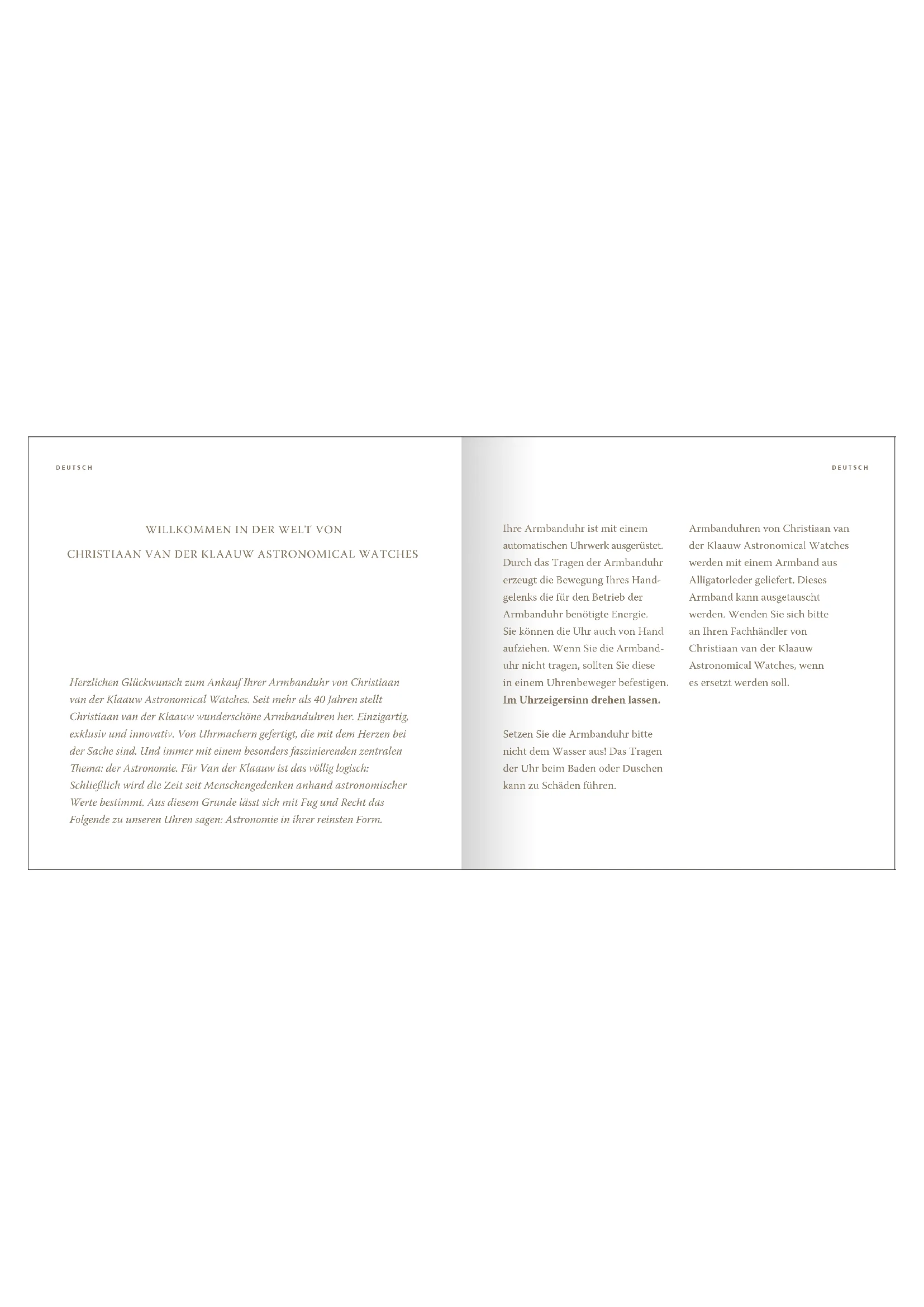 FHerzlichen Glückwunsch zum Ankauf Ihrer Armbanduhr von Christiaan van der Klaauw Astronomical Watches. Seit mehr als 40 Jahren stellt Christiaan van der Klaauw wunderschöne Armbanduhren her. Einzigartig, exklusiv und innovativ. Von Uhrmachern gefertigt, die mit dem Herzen bei der Sache sind. Und immer mit einem besonders faszinierenden zentralen ema: der Astronomie. Für Van der Klaauw ist das völlig logisch: Schließlich wird die Zeit seit Menschengedenken anhand astronomischer Werte bestimmt. Aus diesem Grunde lässt sich mit Fug und Recht das Folgende zu unseren Uhren sagen: Astronomie in ihrer reinsten Form. Ihre Armbanduhr ist mit einem automatischen Uhrwerk ausgerüstet. Durch das Tragen der Armbanduhr erzeugt die Bewegung Ihres Hand- gelenks die für den Betrieb der Armbanduhr benötigte Energie. Sie können die Uhr auch von Hand aufziehen. Wenn Sie die Armband- uhr nicht tragen, sollten Sie diese in einem Uhrenbeweger befestigen. Im Uhrzeigersinn drehen lassen. Setzen Sie die Armbanduhr bitte nicht dem Wasser aus! Das Tragen der Uhr beim Baden oder Duschen kann zu Schäden führen. Armbanduhren von Christiaan van der Klaauw Astronomical Watches werden mit einem Armband aus Alligatorleder geliefert. Dieses Armband kann ausgetauscht werden. Wenden Sie sich bitte an Ihren Fachhändler von Christiaan van der Klaauw Astronomical Watches, wenn es ersetzt werden soll. DEUTSCH