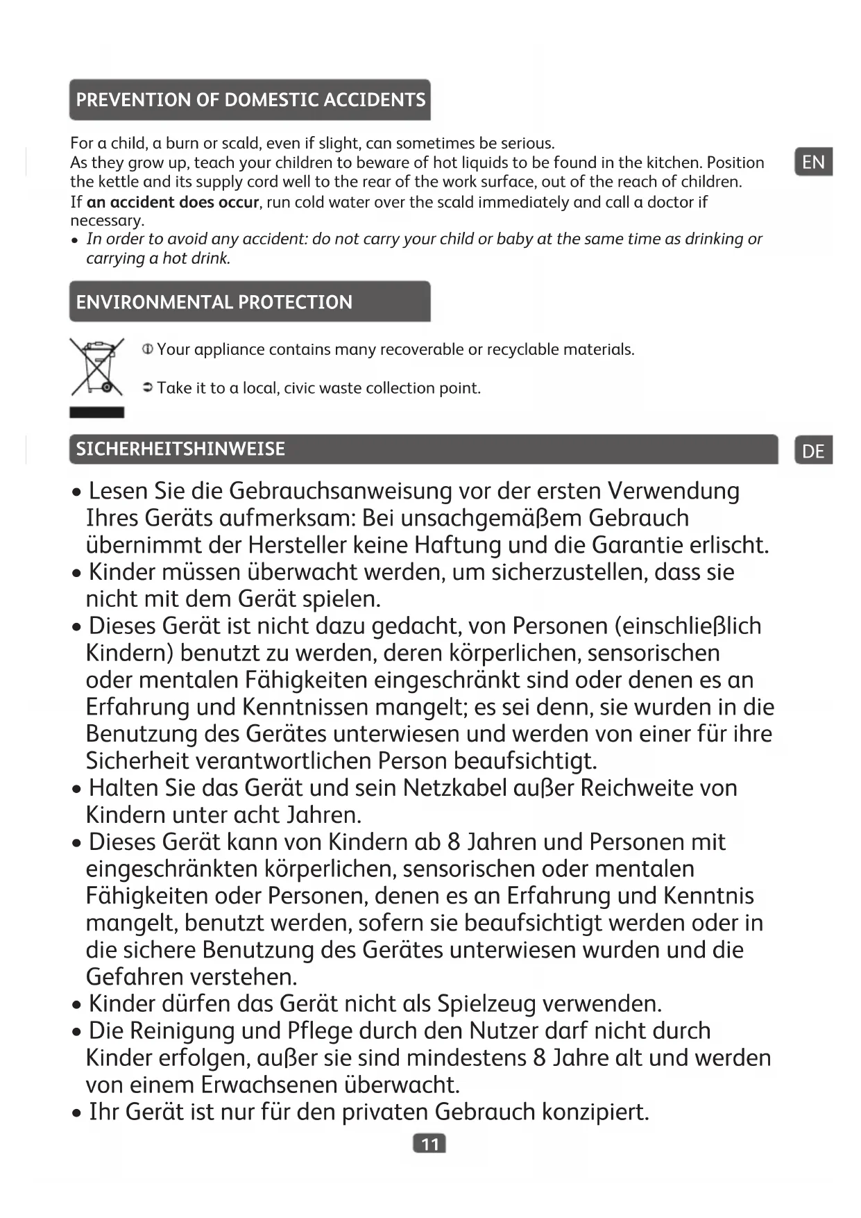SelbstleichteVerbrennungenkönnenfürKindersehrgefährlichsein. BelehrenSieIhreKinder,sichvorheißenFlüssigkeiteninderKücheinAchtzunehmen.Der WasserkocherunddasStromkabelsolltenimhinterenBereichderArbeitsflächeplatziertwerden unddürfensichnichtinReichweitevonKindernbefinden. Sollteein Unfall passieren,lassenSiesofortkaltesWasserüberdieVerbrennunglaufenundholen SiegegebenenfallseinenArzt.