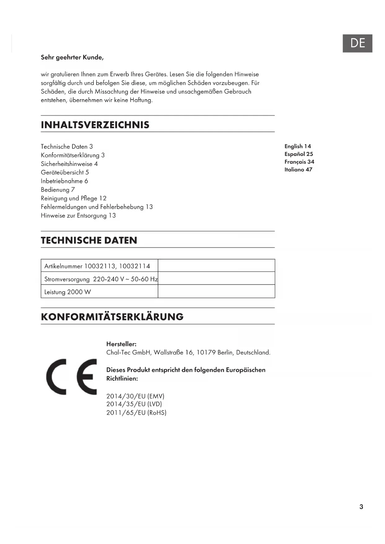 Sehr geehrter Kunde, wir gratulieren Ihnen zum Erwerb Ihres Gerätes. Lesen Sie die folgenden Hinweise sorgfältig durch und befolgen Sie diese, um möglichen Schäden vorzubeugen. Für Schäden, die durch Missachtung der Hinweise und unsachgemäßen Gebrauch entstehen, übernehmen wir keine Haftung. INHALTSVERZEICHNIS Technische Daten 3 Konformitätserklärung 3 Sicherheitshinweise4 Geräteübersicht5 Inbetriebnahme6 Bedienung7 Reinigung und Pege12 Fehlermeldungen und Fehlerbehebung13 Hinweise zur Entsorgung13 TECHNISCHE DATEN Artikelnummer 10032113, 10032114 Stromversorgung 220-240 V ~ 50-60 Hz Leistung 2000 W