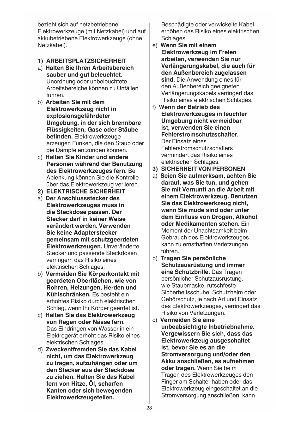 ELEKTROWERKZEUGEN a) Überlasten Sie das Elektrowerkzeug nicht. Verwenden Sie für Ihre Arbeit das dafür bestimmte Elektrowerkzeug. Mit dem passenden Elektrowerkzeug arbeiten Sie besser und sicherer im angegebenen Leistungsbereich. b) Benutzen Sie kein Elektrowerkzeug, dessen Schalter defekt ist. Ein Elektrowerkzeug, das sich nicht mehr ein- oder ausschalten lässt, ist gefährlich und muss repariert werden.25
