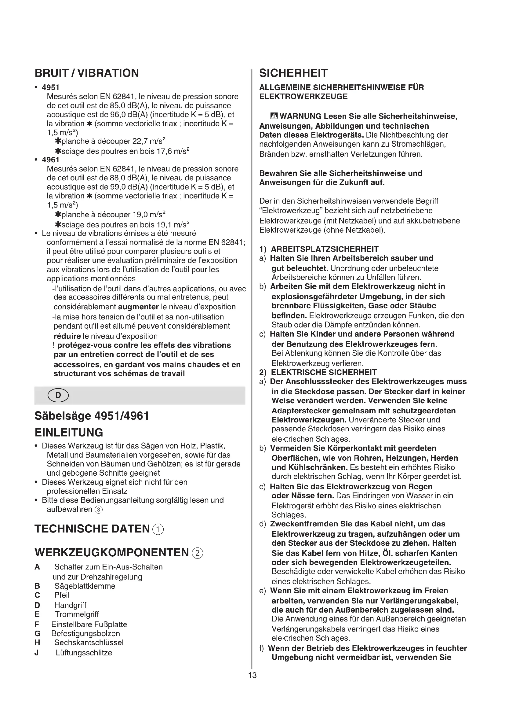 - 4961 Gemessen nach EN 62841 beträgt der Schalldruckpegel dieses Werkzeugs 88,0 dB(A) und der Schallleistungspegel 99,0 dB(A) (Unsicherheit K = 5 dB), und die Schwingung ✱ (Triaxvektorsumme; Unsicherheit K = 1,5 m/s²) ✱ Schneidbrett 19,0 m/s² ✱ Sägen von Holzbalken 19,1 m/s²