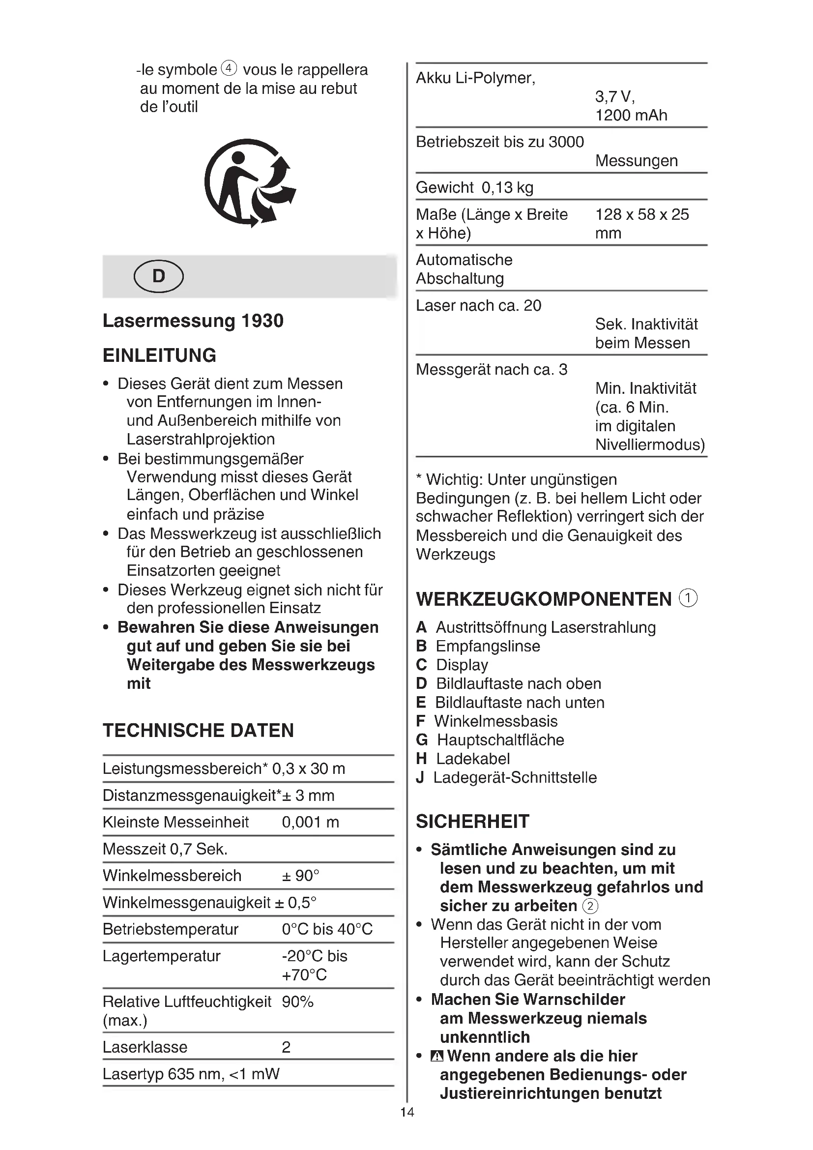 - Bewahren Sie diese Anweisungen gut auf und geben Sie sie bei Weitergabe des Messwerkzeugs mit TECHNISCHE DATEN Leistungsmessbereich* 0,3 x 30 m Distanzmessgenauigkeit*± 3 mm Kleinste Messeinheit 0,001 m Messzeit 0,7 Sek. Winkelmessbereich ± 90° Winkelmessgenauigkeit ± 0,5° Betriebstemperatur 0°C bis 40°C Lagertemperatur -20°C bis +70°C Relative Luftfeuchtigkeit (max.) 90% Laserklasse 2 Lasertyp 635 nm, <1 mW15 Sie das Elektrowerkzeug zum ersten Mal verwenden) ! Lesen und befolgen Sie die mit dem Ladegerät gelieferten Anweisungen - Verwenden Sie nur ein Ladegerät oder Netzteil mit einer Ausgangsspannung von 5 V und einem Ausgangsstrom von ≥0,5 A - Ladekabel H mit Ladegerät oder Netzteil (nicht im Lieferumfang enthalten) und Ladegerät- Schnittstelle J - wenn das Gerät angeschlossen ist, schaltet es sich ein und die Batteriestandsanzeige