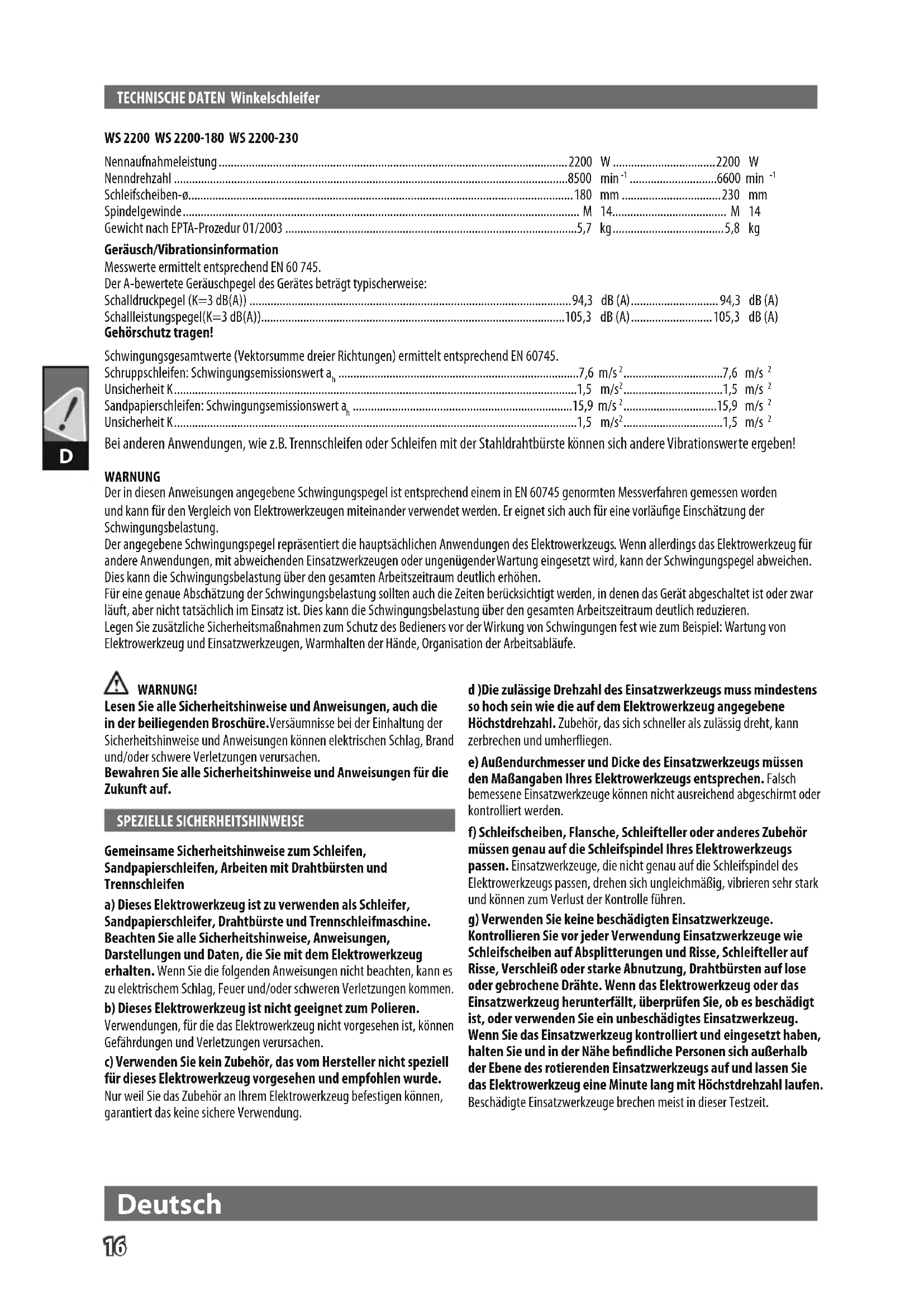 Bei anderen Anwendungen, wie z.B. Trennschleifen oder Schleifen mit der Stahldrahtbürste können sich andere Vibrationswerte ergeben! WARNUNG Der in diesen Anweisungen angegebene Schwingungspegel ist entsprechend einem in EN 60745 genormten Messverfahren gemessen worden und kann für den Vergleich von Elektrowerkzeugen miteinander verwendet werden. Er eignet sich auch für eine vorläuge Einschätzung der Schwingungsbelastung. Der angegebene Schwingungspegel repräsentiert die hauptsächlichen Anwendungen des Elektrowerkzeugs. Wenn allerdings das Elektrowerkzeug für andere Anwendungen, mit abweichenden Einsatzwerkzeugen oder ungenügender Wartung eingesetzt wird, kann der Schwingungspegel abweichen. Dies kann die Schwingungsbelastung über den gesamten Arbeitszeitraum deutlich erhöhen. Für eine genaue Abschätzung der Schwingungsbelastung sollten auch die Zeiten berücksichtigt werden, in denen das Gerät abgeschaltet ist oder zwar läuft, aber nicht tatsächlich im Einsatz ist. Dies kann die Schwingungsbelastung über den gesamten Arbeitszeitraum deutlich reduzieren. Legen Sie zusätzliche Sicherheitsmaßnahmen zum Schutz des Bedieners vor der Wirkung von Schwingungen fest wie zum Beispiel: Wartung von Elektrowerkzeug und Einsatzwerkzeugen, Warmhalten der Hände, Organisation der Arbeitsabläufe. WARNUNG! Lesen Sie alle Sicherheitshinweise und Anweisungen, auch die in der beiliegenden Broschüre.Versäumnisse bei der Einhaltung der Sicherheitshinweise und Anweisungen können elektrischen Schlag, Brand und/oder schwere Verletzungen verursachen. Bewahren Sie alle Sicherheitshinweise und Anweisungen für die Zukunft auf. SPEZIELLE SICHERHEITSHINWEISE Gemeinsame Sicherheitshinweise zum Schleifen, Sandpapierschleifen, Arbeiten mit Drahtbürsten und Trennschleifen a) Dieses Elektrowerkzeug ist zu verwenden als Schleifer, Sandpapierschleifer, Drahtbürste und Trennschleifmaschine. Beachten Sie alle Sicherheitshinweise, Anweisungen, Darstellungen und Daten, die Sie mit dem Elektrowerkzeug erhalten. Wenn Sie die folgenden Anweisungen nicht beachten, kann es zu elektrischem Schlag, Feuer und/oder schweren Verletzungen kommen. b) Dieses Elektrowerkzeug ist nicht geeignet zum Polieren. Verwendungen, für die das Elektrowerkzeug nicht vorgesehen ist, können Gefährdungen und Verletzungen verursachen. c) Verwenden Sie kein Zubehör, das vom Hersteller nicht speziell für dieses Elektrowerkzeug vorgesehen und empfohlen wurde. Nur weil Sie das Zubehör an Ihrem Elektrowerkzeug befestigen können, garantiert das keine sichere Verwendung. d )Die zulässige Drehzahl des Einsatzwerkzeugs muss mindestens so hoch sein wie die auf dem Elektrowerkzeug angegebene Höchstdrehzahl. Zubehör, das sich schneller als zulässig dreht, kann zerbrechen und umheriegen. e) Außendurchmesser und Dicke des Einsatzwerkzeugs müssen den Maßangaben Ihres Elektrowerkzeugs entsprechen. Falsch bemessene Einsatzwerkzeuge können nicht ausreichend abgeschirmt oder kontrolliert werden. f) Schleifscheiben, Flansche, Schleifteller oder anderes Zubehör müssen genau auf die Schleifspindel Ihres Elektrowerkzeugs passen. Einsatzwerkzeuge, die nicht genau auf die Schleifspindel des Elektrowerkzeugs passen, drehen sich ungleichmäßig, vibrieren sehr stark und können zum Verlust der Kontrolle führen. g) Verwenden Sie keine beschädigten Einsatzwerkzeuge. Kontrollieren Sie vor jeder Verwendung Einsatzwerkzeuge wie Schleifscheiben auf Absplitterungen und Risse, Schleifteller auf Risse, Verschleiß oder starke Abnutzung, Drahtbürsten auf lose oder gebrochene Drähte. Wenn das Elektrowerkzeug oder das Einsatzwerkzeug herunterfällt, überprüfen Sie, ob es beschädigt ist, oder verwenden Sie ein unbeschädigtes Einsatzwerkzeug. Wenn Sie das Einsatzwerkzeug kontrolliert und eingesetzt haben, halten Sie und in der Nähe bendliche Personen sich außerhalb der Ebene des rotierenden Einsatzwerkzeugs auf und lassen Sie das Elektrowerkzeug eine Minute lang mit Höchstdrehzahl laufen. Beschädigte Einsatzwerkzeuge brechen meist in dieser Testzeit.17