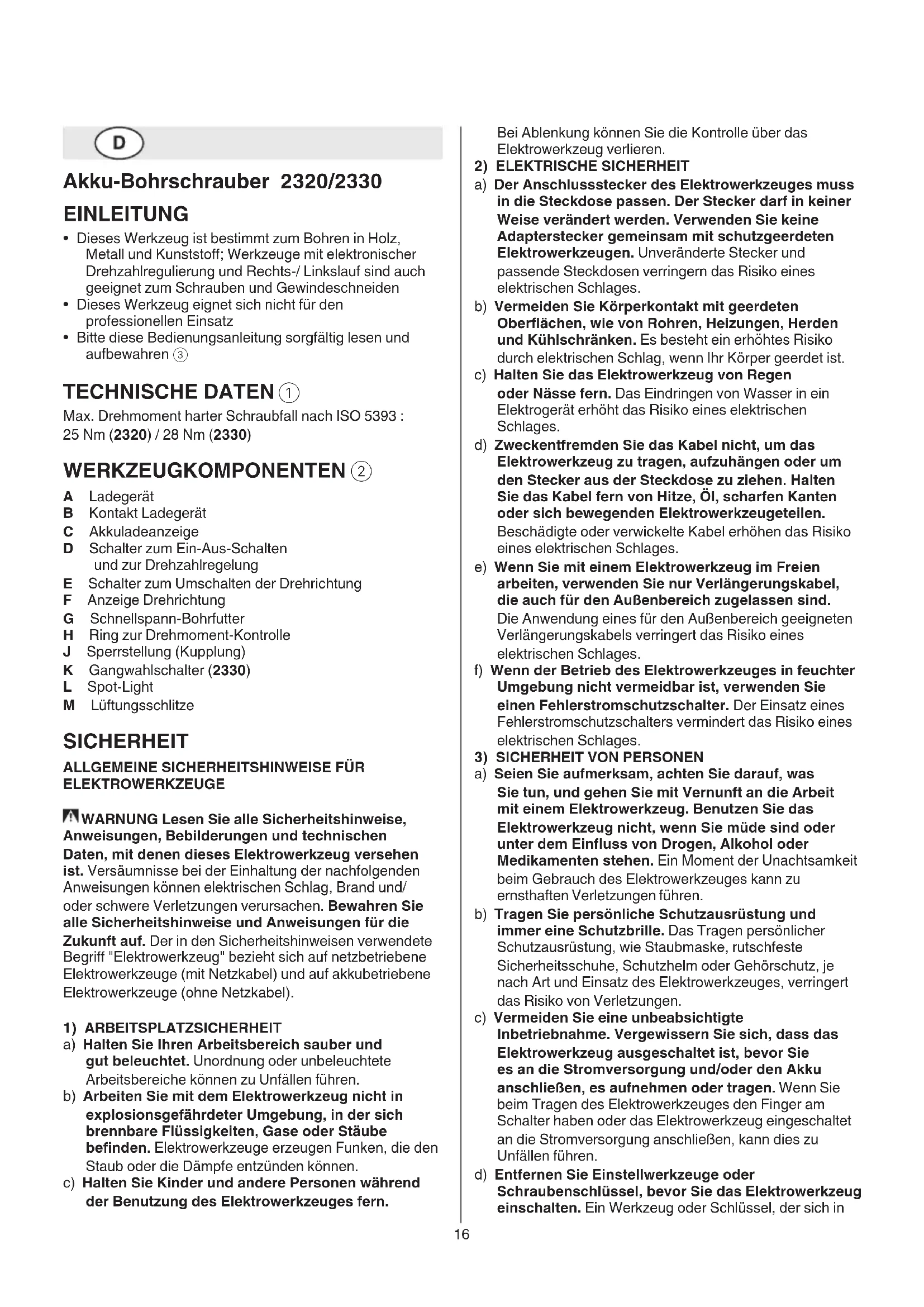 A Ladegerät B Kontakt Ladegerät C Akkuladeanzeige D Schalter zum Ein-Aus-Schalten und zur Drehzahlregelung E Schalter zum Umschalten der Drehrichtung F Anzeige Drehrichtung G Schnellspann-Bohrfutter H Ring zur Drehmoment-Kontrolle J Sperrstellung (Kupplung) K Gangwahlschalter (2330) L Spot-Light M Lüftungsschlitze SICHERHEIT
