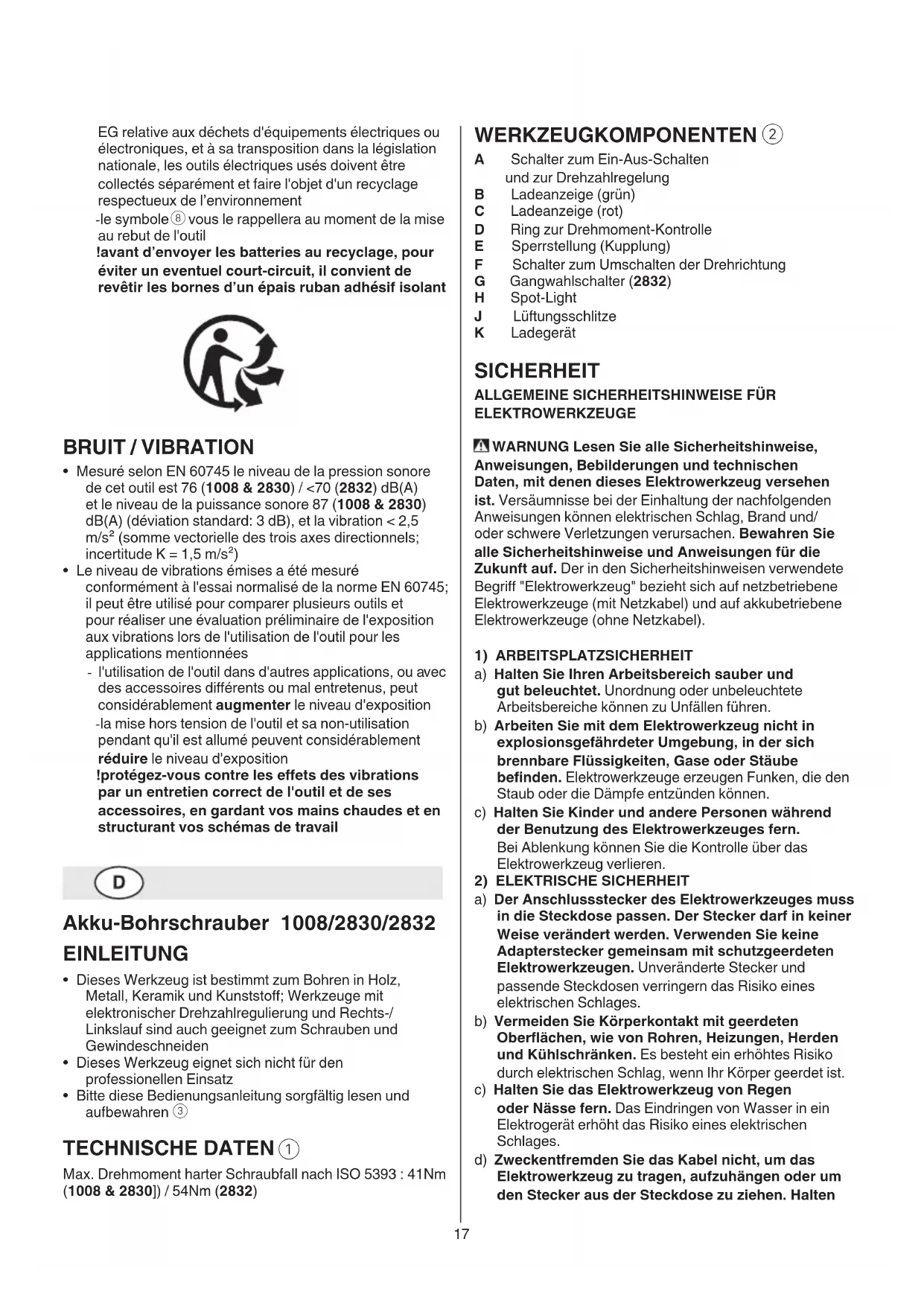 - Die Vibrationsemissionsstufe wurde mit einem standardisierten Test gemäß EN 60745 gemessen; Sie kann verwendet werden, um ein Werkzeug mit einem anderen zu vergleichen und als vorläuge Beurteilung der Vibrationsexposition bei Verwendung des Werkzeugs für die angegebenen Anwendungszwecke - die Verwendung des Werkzeugs für andere Anwendungen oder mit anderem oder schlecht gewartetem Zubehör kann die Expositionsstufe erheblich erhöhen - Zeiten, zu denen das Werkzeug ausgeschaltet ist, oder wenn es läuft aber eigentlich nicht eingesetzt wird, können die Expositionsstufe erheblich verringern ! schützen Sie sich vor den Auswirkungen der Vibration durch Wartung des Werkzeugs und des Zubehörs, halten Sie Ihre Hände warm und organisieren Sie Ihren Arbeitsablauf Oplaadbare boor-/ 1008/2830/2832 schroefmachine INTRODUCTIE