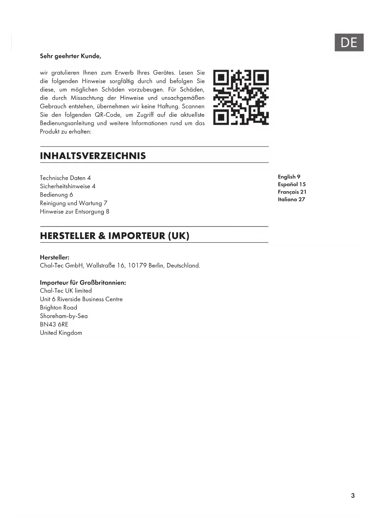 Sehr geehrter Kunde, wir gratulieren Ihnen zum Erwerb Ihres Gerätes. Lesen Sie die folgenden Hinweise sorgfältig durch und befolgen Sie diese, um möglichen Schäden vorzubeugen. Für Schäden, die durch Missachtung der Hinweise und unsachgemäßen Gebrauch entstehen, übernehmen wir keine Haftung. Scannen Sie den folgenden QR-Code, um Zugriff auf die aktuellste Bedienungsanleitung und weitere Informationen rund um das Produkt zu erhalten: INHALTSVERZEICHNIS English 9 Español 15 Français 21 Italiano 27 Technische Daten4 Sicherheitshinweise4 Bedienung6 Reinigung und Wartung7 Hinweise zur Entsorgung8 HERSTELLER & IMPORTEUR (UK) Hersteller: Chal-Tec GmbH, Wallstraße 16, 10179 Berlin, Deutschland. Importeur für Großbritannien: Chal-Tec UK limited Unit 6 Riverside Business Centre Brighton Road Shoreham-by-Sea BN43 6RE United Kingdom4