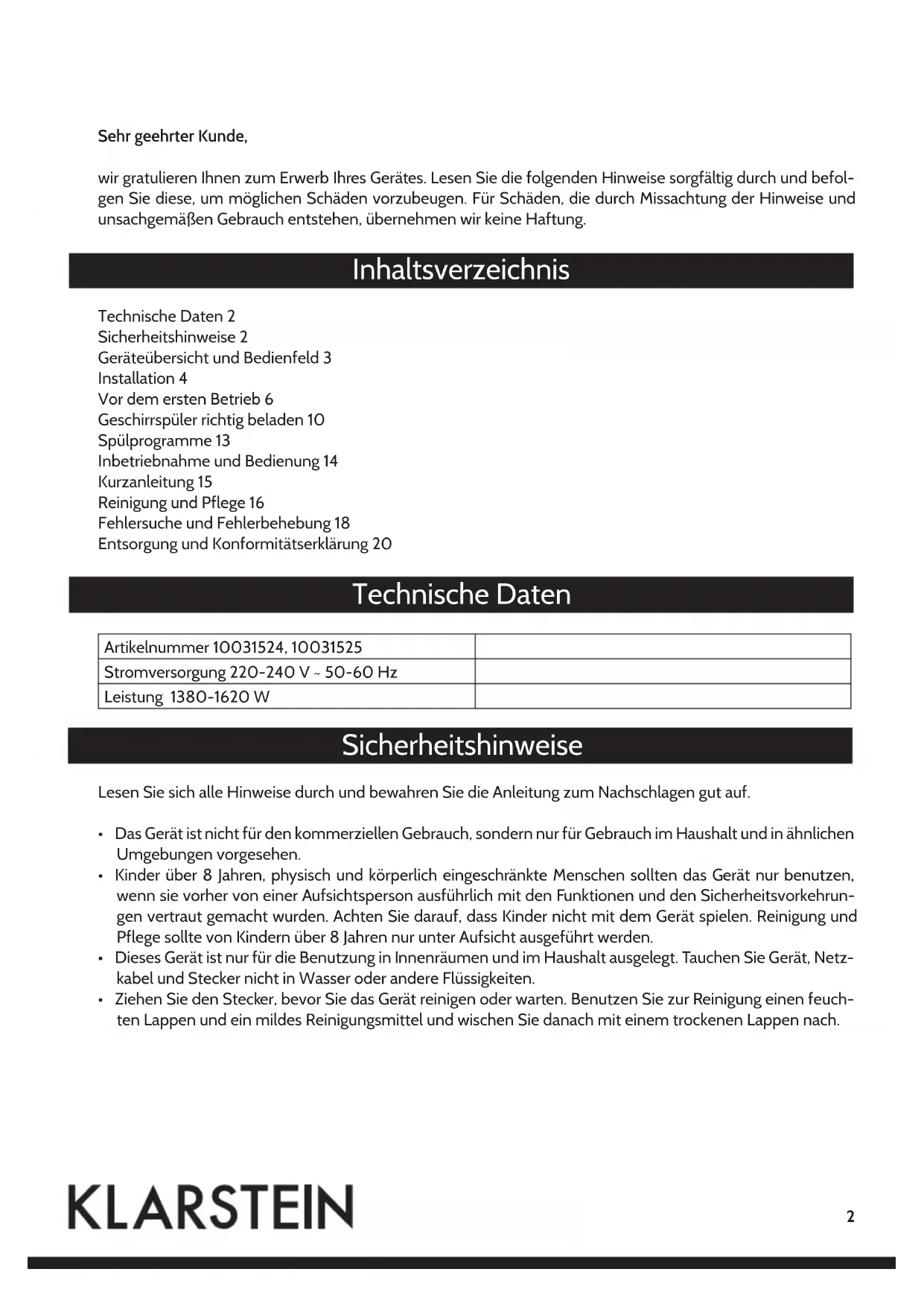 Geschirrspüler2 Sehr geehrter Kunde, wir gratulieren Ihnen zum Erwerb Ihres Gerätes. Lesen Sie die folgenden Hinweise sorgfältig durch und befol- gen Sie diese, um möglichen Schäden vorzubeugen. Für Schäden, die durch Missachtung der Hinweise und unsachgemäßen Gebrauch entstehen, übernehmen wir keine Haftung. Inhaltsverzeichnis Technische Daten 2 Sicherheitshinweise 2 Geräteübersicht und Bedienfeld 3 Installation 4 Vor dem ersten Betrieb 6 Geschirrspüler richtig beladen 10 Spülprogramme 13 Inbetriebnahme und Bedienung 14 Kurzanleitung 15 Reinigung und Pflege 16 Fehlersuche und Fehlerbehebung 18 Entsorgung und Konformitätserklärung 20 Technische Daten Artikelnummer 10031524, 10031525 Stromversorgung 220-240 V ~ 50-60 Hz Leistung 1380-1620 W Sicherheitshinweise Lesen Sie sich alle Hinweise durch und bewahren Sie die Anleitung zum Nachschlagen gut auf.