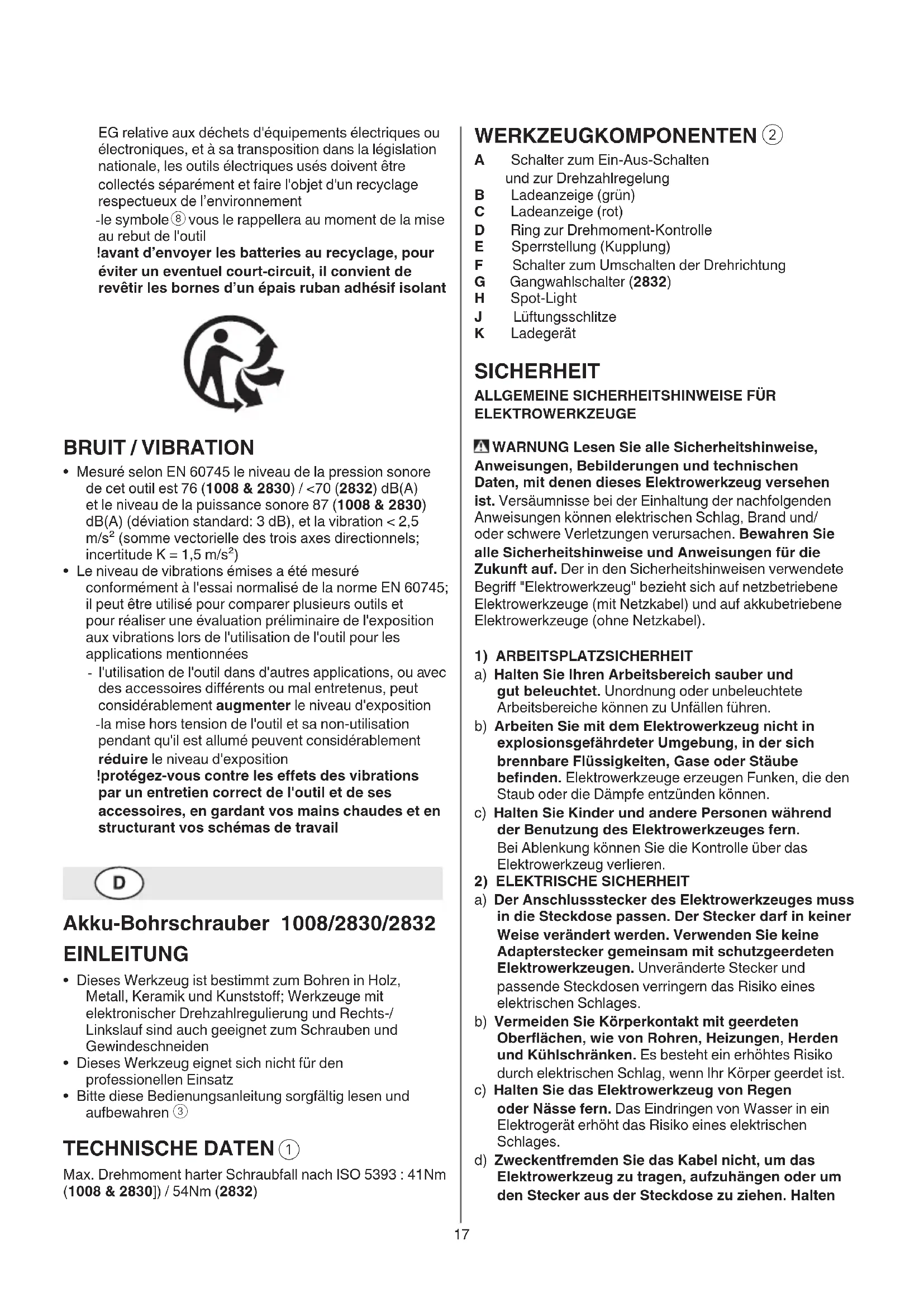 - Die Vibrationsemissionsstufe wurde mit einem standardisierten Test gemäß EN 60745 gemessen; Sie kann verwendet werden, um ein Werkzeug mit einem anderen zu vergleichen und als vorläuge Beurteilung der Vibrationsexposition bei Verwendung des Werkzeugs für die angegebenen Anwendungszwecke - die Verwendung des Werkzeugs für andere Anwendungen oder mit anderem oder schlecht gewartetem Zubehör kann die Expositionsstufe erheblich erhöhen - Zeiten, zu denen das Werkzeug ausgeschaltet ist, oder wenn es läuft aber eigentlich nicht eingesetzt wird, können die Expositionsstufe erheblich verringern ! schützen Sie sich vor den Auswirkungen der Vibration durch Wartung des Werkzeugs und des Zubehörs, halten Sie Ihre Hände warm und organisieren Sie Ihren Arbeitsablauf Oplaadbare boor-/ 1008/2830/2832 schroefmachine INTRODUCTIE