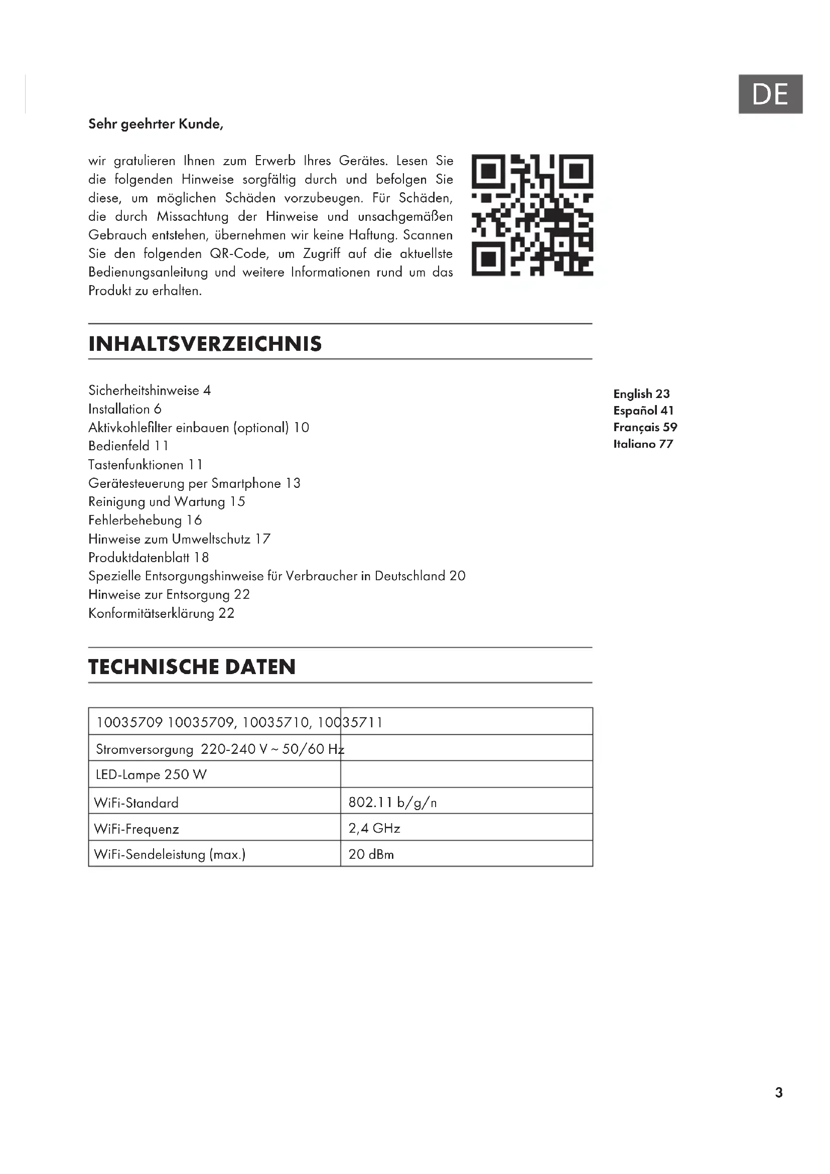 Sehr geehrter Kunde, wir gratulieren Ihnen zum Erwerb Ihres Gerätes. Lesen Sie die folgenden Hinweise sorgfältig durch und befolgen Sie diese, um möglichen Schäden vorzubeugen. Für Schäden, die durch Missachtung der Hinweise und unsachgemäßen Gebrauch entstehen, übernehmen wir keine Haftung. Scannen Sie den folgenden QR-Code, um Zugriff auf die aktuellste Bedienungsanleitung und weitere Informationen rund um das Produkt zu erhalten. INHALTSVERZEICHNIS Sicherheitshinweise4 Installation6 Aktivkohlelter einbauen (optional)10 Bedienfeld11 Tastenfunktionen11 Gerätesteuerung per Smartphone13 Reinigung und Wartung15 Fehlerbehebung16 Hinweise zum Umweltschutz17 Produktdatenblatt18 Spezielle Entsorgungshinweise für Verbraucher in Deutschland20 Hinweise zur Entsorgung22 Konformitätserklärung22 TECHNISCHE DATEN 10035709 10035709, 10035710, 10035711 Stromversorgung 220-240 V ~ 50/60 Hz LED-Lampe 250 W WiFi-Standard