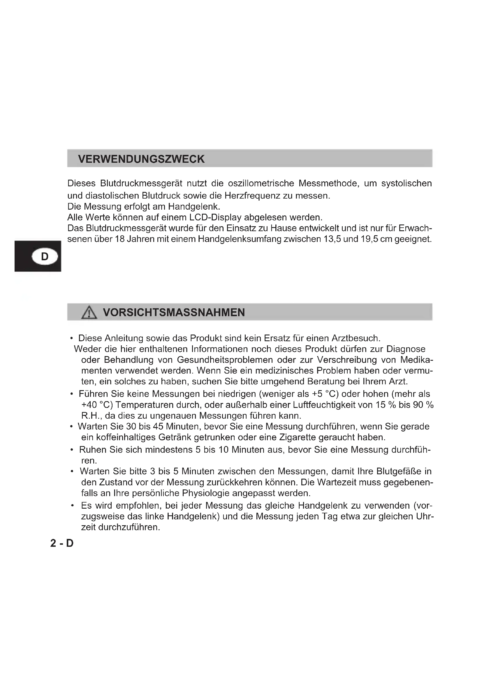 VERWENDUNGSZWECK Dieses Blutdruckmessgerät nutzt die oszillometrische Messmethode, um systolischen und diastolischen Blutdruck sowie die Herzfrequenz zu messen. Die Messung erfolgt am Handgelenk. Alle Werte können auf einem LCD-Display abgelesen werden. Das Blutdruckmessgerät wurde für den Einsatz zu Hause entwickelt und ist nur für Erwach- senen über 18 Jahren mit einem Handgelenksumfang zwischen 13,5 und 19,5 cm geeignet. VORSICHTSMASSNAHMEN