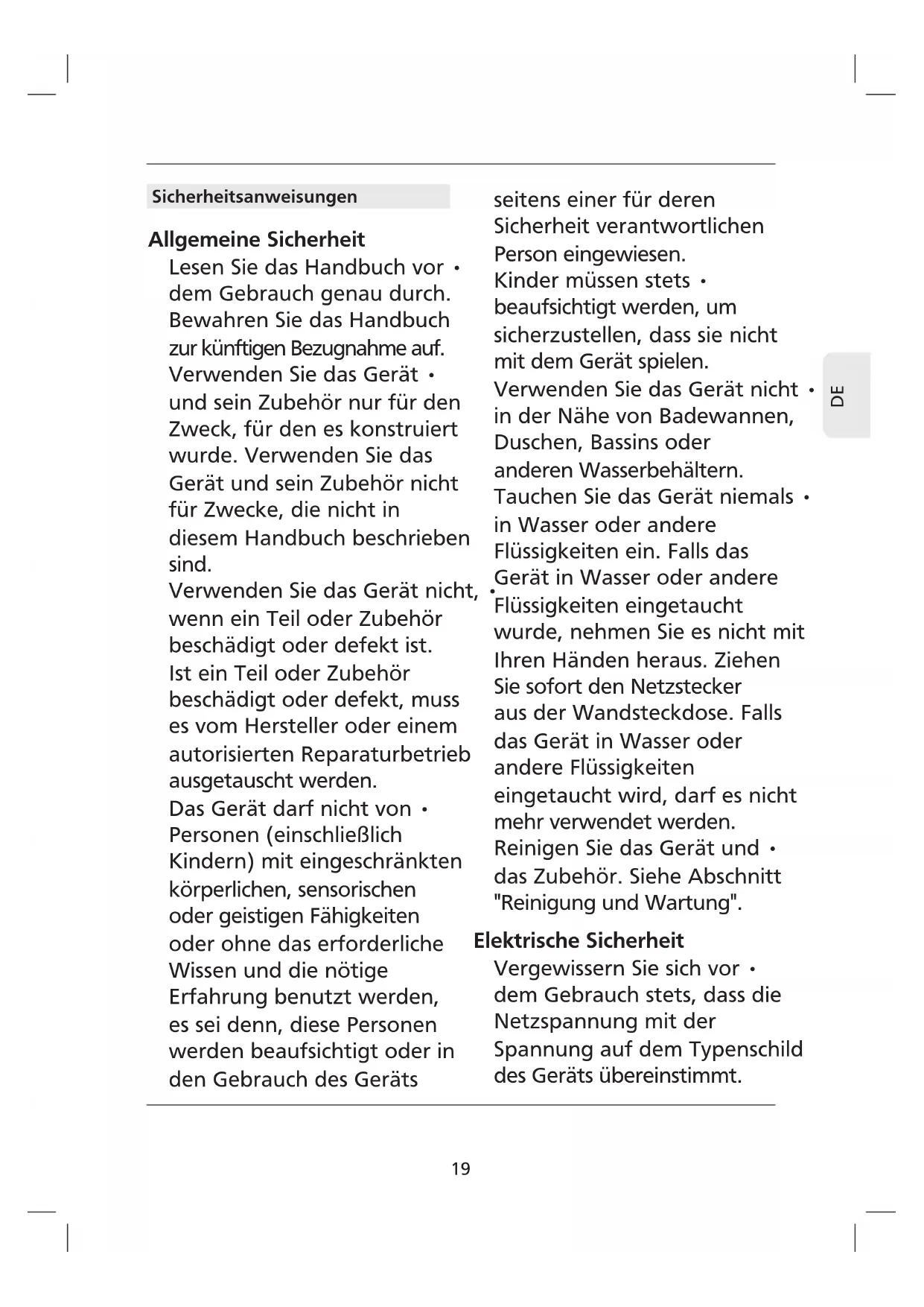 Sicherheitsanweisungen Allgemeine Sicherheit Lesen Sie das Handbuch vor • dem Gebrauch genau durch. Bewahren Sie das Handbuch zur künftigen Bezugnahme auf. Verwenden Sie das Gerät • und sein Zubehör nur für den Zweck, für den es konstruiert wurde. Verwenden Sie das Gerät und sein Zubehör nicht für Zwecke, die nicht in diesem Handbuch beschrieben sind. Verwenden Sie das Gerät nicht, • wenn ein Teil oder Zubehör beschädigt oder defekt ist. Ist ein Teil oder Zubehör beschädigt oder defekt, muss es vom Hersteller oder einem autorisierten Reparaturbetrieb ausgetauscht werden. Das Gerät darf nicht von • Personen (einschließlich Kindern) mit eingeschränkten körperlichen, sensorischen oder geistigen Fähigkeiten oder ohne das erforderliche Wissen und die nötige Erfahrung benutzt werden, es sei denn, diese Personen werden beaufsichtigt oder in den Gebrauch des Geräts seitens einer für deren Sicherheit verantwortlichen Person eingewiesen. Kinder müssen stets • beaufsichtigt werden, um sicherzustellen, dass sie nicht mit dem Gerät spielen. Verwenden Sie das Gerät nicht • in der Nähe von Badewannen, Duschen, Bassins oder anderen Wasserbehältern. Tauchen Sie das Gerät niemals • in Wasser oder andere Flüssigkeiten ein. Falls das Gerät in Wasser oder andere Flüssigkeiten eingetaucht wurde, nehmen Sie es nicht mit Ihren Händen heraus. Ziehen Sie sofort den Netzstecker aus der Wandsteckdose. Falls das Gerät in Wasser oder andere Flüssigkeiten eingetaucht wird, darf es nicht mehr verwendet werden. Reinigen Sie das Gerät und • das Zubehör. Siehe Abschnitt "Reinigung und Wartung". Elektrische Sicherheit Vergewissern Sie sich vor • dem Gebrauch stets, dass die Netzspannung mit der Spannung auf dem Typenschild des Geräts übereinstimmt.20