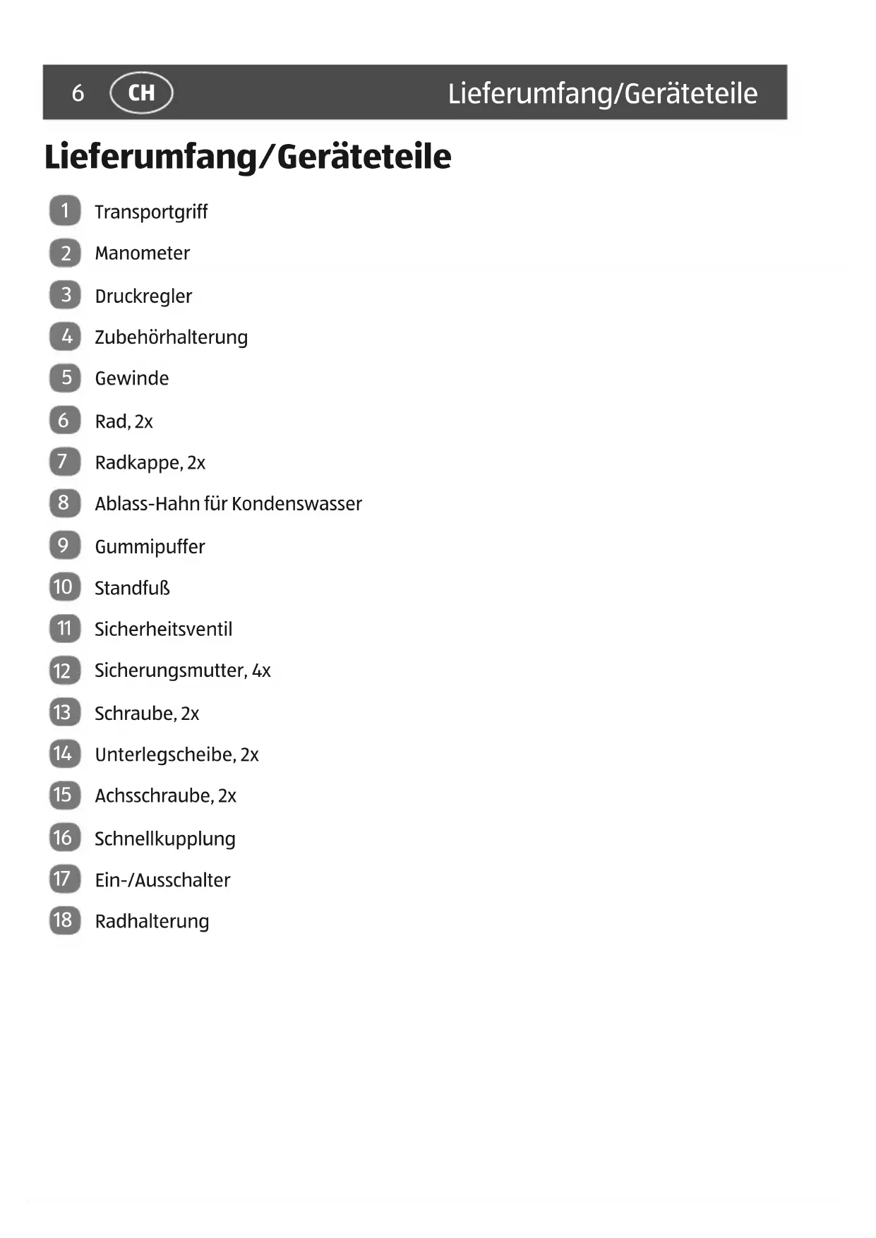 Transportgriff Manometer Druckregler Zubehörhalterung Gewinde Rad, 2x Radkappe, 2x Ablass-Hahn für Kondenswasser Gummipuffer Standfuß Sicherheitsventil Sicherungsmutter, 4x Schraube, 2x Unterlegscheibe, 2x Achsschraube, 2x Schnellkupplung Ein-/Ausschalter Radhalterung7 Allgemeines
