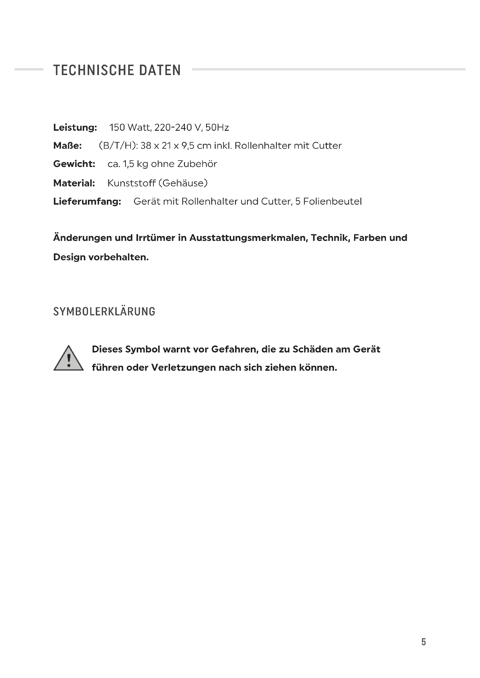 | Inklusive Zubehör | Vakuumfolienrollen und kompatible Beutel. |