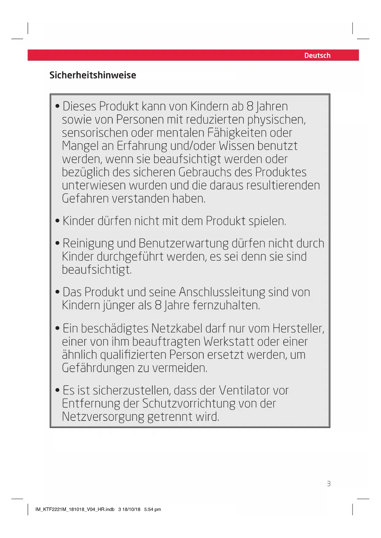 - Es ist sicherzustellen, dass der Ventilator vor Entfernung der Schutzvorrichtung von der Netzversorgung getrennt wird. IM_KTF2221M_181018_V04_HR.indb 3 18/10/18 5:54 pmDeutsch