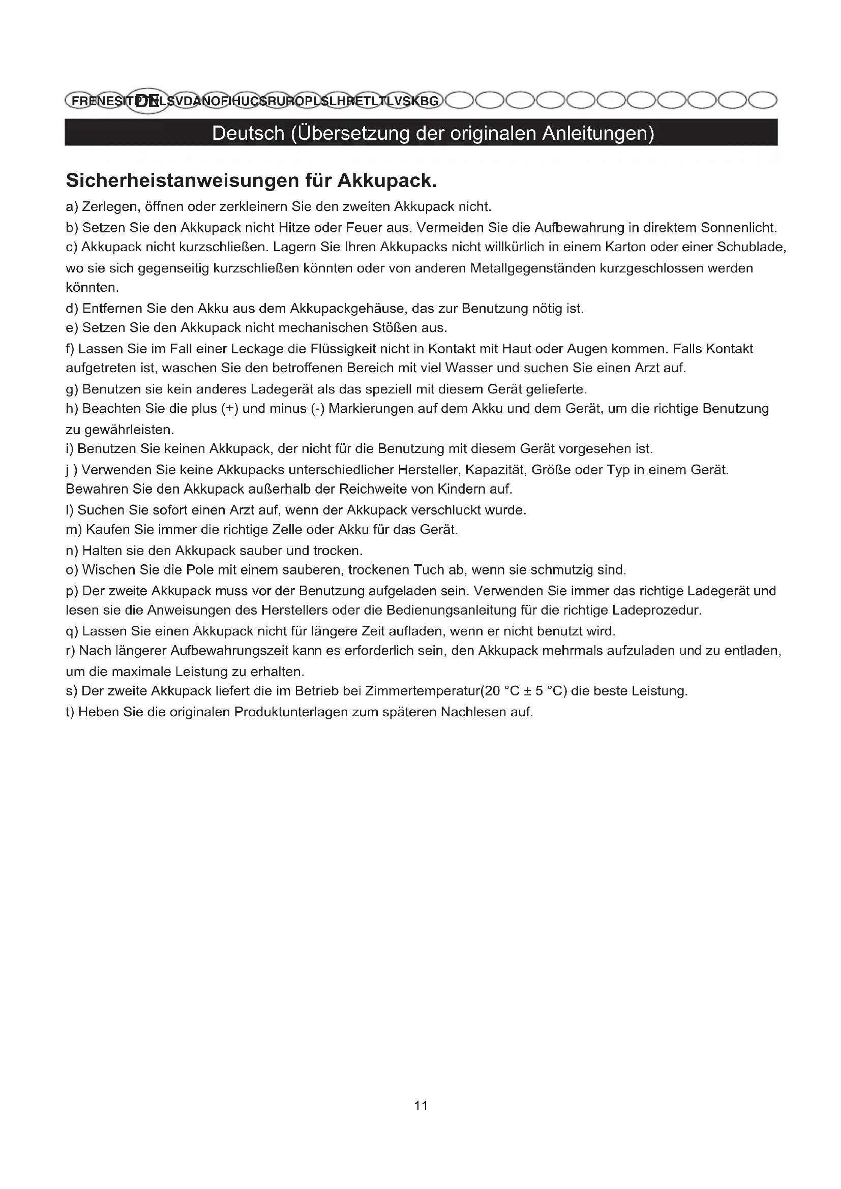 j ) Verwenden Sie keine Akkupacks unterschiedlicher Hersteller, Kapazität, Größe oder Typ in einem Gerät. Bewahren Sie den Akkupack außerhalb der Reichweite von Kindern auf. l) Suchen Sie sofort einen Arzt auf, wenn der Akkupack verschluckt wurde. m) Kaufen Sie immer die richtige Zelle oder Akku für das Gerät. n) Halten sie den Akkupack sauber und trocken. o) Wischen Sie die Pole mit einem sauberen, trockenen Tuch ab, wenn sie schmutzig sind. p) Der zweite Akkupack muss vor der Benutzung aufgeladen sein. Verwenden Sie immer das richtige Ladegerät und lesen sie die Anweisungen des Herstellers oder die Bedienungsanleitung für die richtige Ladeprozedur. q) Lassen Sie einen Akkupack nicht für längere Zeit aufladen, wenn er nicht benutzt wird. r) Nach längerer Aufbewahrungszeit kann es erforderlich sein, den Akkupack mehrmals aufzuladen und zu entladen, um die maximale Leistung zu erhalten. s) Der zweite Akkupack liefert die im Betrieb bei Zimmertemperatur(20 °C ± 5 °C) die beste Leistung. t) Heben Sie die originalen Produktunterlagen zum späteren Nachlesen auf.