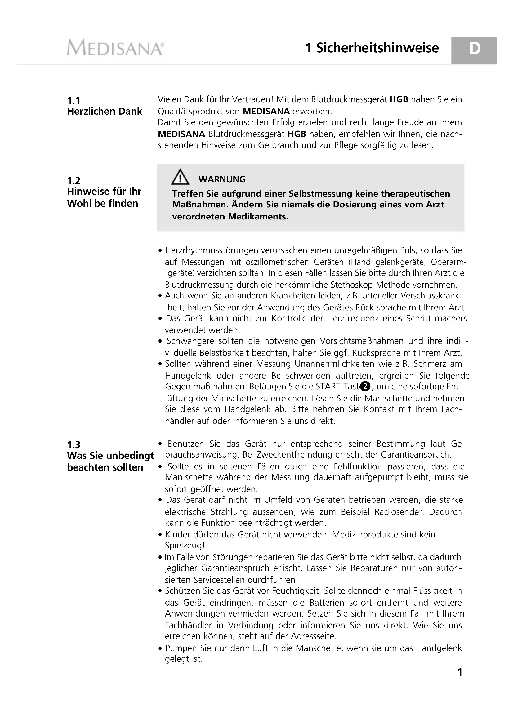 fVielen Dank für Ihr Vertrauen! Mit dem Blutdruckmessgerät HGB haben Sie ein Qualitätsprodukt von MEDISANA erworben. Damit Sie den gewünschten Erfolg erzielen und recht lange Freude an Ihrem MEDISANA Blutdruckmessgerät HGB haben, empfehlen wir Ihnen, die nach- stehenden Hinweise zum Ge brauch und zur Pflege sorgfältig zu lesen.WARNUNGTreffen Sie aufgrund einer Selbstmessung keine therapeutischen Maßnahmen. Ändern Sie niemals die Dosierung eines vom Arzt verordneten Medikaments.• Herzrhythmusstörungen verursachen einen unregelmäßigen Puls, so dass Sieauf Messungen mit oszillometrischen Geräten (Hand gelenkgeräte, Oberarm- geräte) verzichten sollten. In diesen Fällen lassen Sie bitte durch Ihren Arzt die Blutdruckmessung durch die her kömm l iche Stethoskop-Methode vornehmen.