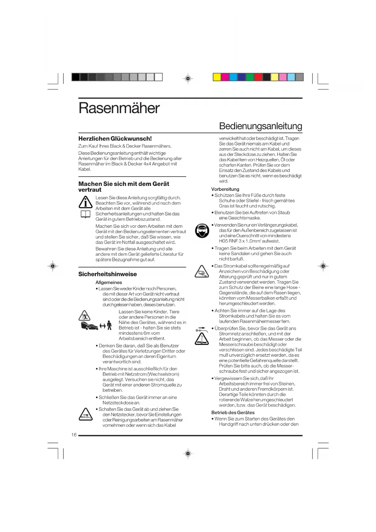 Brian Cooke Direttore di Ricerca e Sviluppo Spennymoor, County Durham DL16 6JG, United Kingdom 1-12-2001 Altrimenti un elenco completo di tutti i tecnici autorizzati Black & Decker e i dettagli completi sui contatti e i servizi post-vendita sono disponibili su Internet presso: www.2helpU.com. Altri utensili di giardinaggio La Black & Decker ha una gamma completa di utensili per il giardinaggio che rende semplice la vita in giardino. Se desiderate ulteriori informazioni sui seguenti prodotti, vi preghiamo di contattare il nostro Centro D’Informazione e Manutenzione (vedere la pagina degli indirizzi alla fine di questo libretto d’istruzioni) od il vostro rivenditore Black & Decker Tosatori a lame o a catena Motoseghe Scope elettriche Tosasiepi a batteria Tagliasiepi a batteria Tosasiepi Tosaerba Rastrelli Sramatori Biotrituratori Non tutti i prodotti sono disponibili in tutti i paesi.16 Rasenmäher Herzlichen Glückwunsch! Zum Kauf Ihres Black & Decker Rasenmähers. Diese Bedienungsanleitung enthält wichtige Anleitungen für den Betrieb und die Bedienung aller Rasenmäher im Black & Decker 4x4 Angebot mit Kabel. Machen Sie sich mit dem Gerät vertraut Lesen Sie diese Anleitung sorgfältig durch. Beachten Sie vor, während und nach dem Arbeiten mit dem Gerät alle Sicherheitsanleitungen und halten Sie das Gerät in gutem Betriebszustand. Machen Sie sich vor dem Arbeiten mit dem Gerät mit den Bedienungselementen vertraut und stellen Sie sicher, daß Sie wissen, wie das Gerät im Notfall ausgeschaltet wird. Bewahren Sie diese Anleitung und alle andere mit dem Gerät gelieferte Literatur für spätere Bezugnahme gut auf. Sicherheitshinweise Allgemeines
