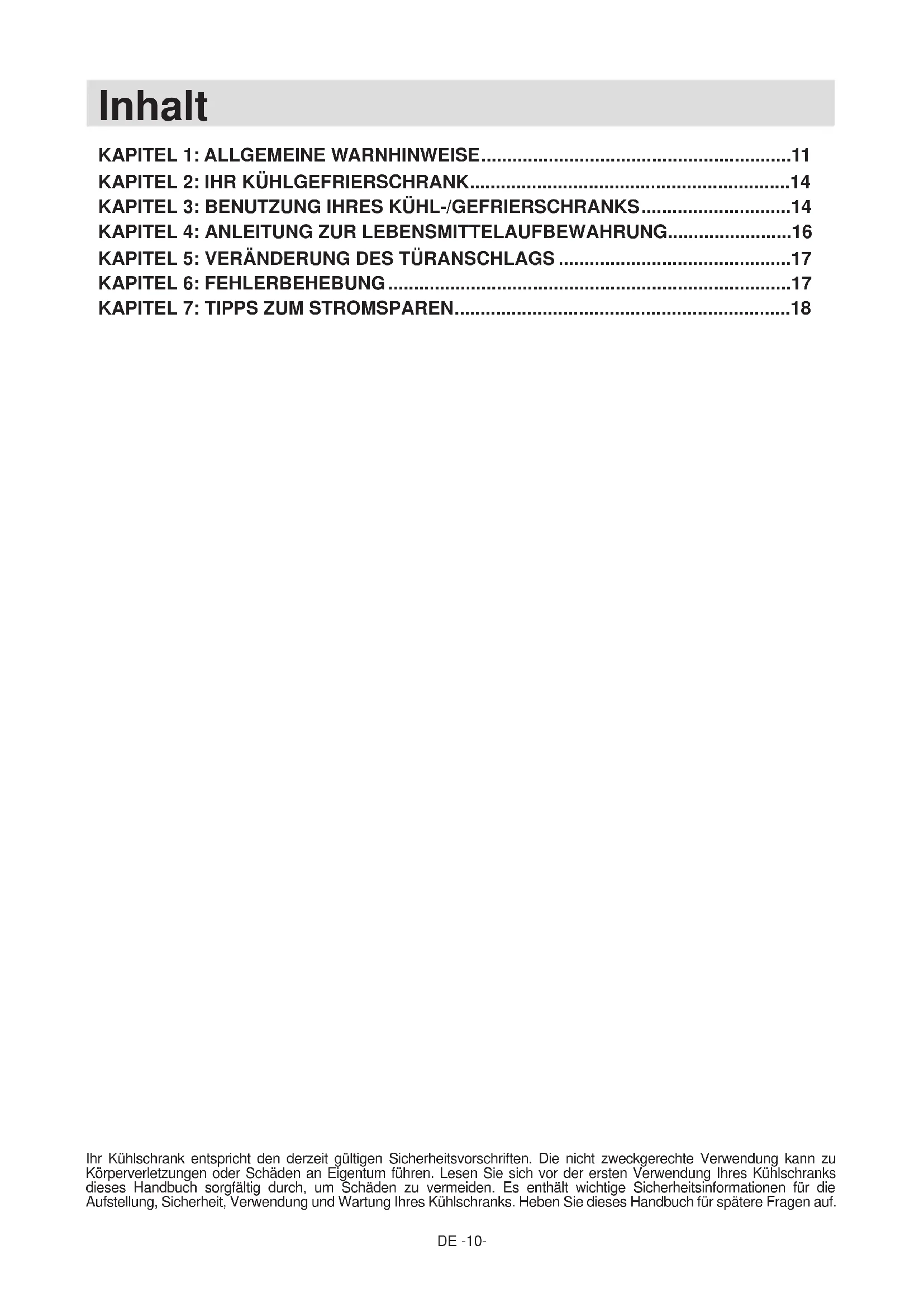 - The appliance is designed in compliance with the IEC60335-1 / IEC60335-2-24, 2004/108/EC standards.DE -10- Ihr Kühlschrank entspricht den derzeit gültigen Sicherheitsvorschriften. Die nicht zweckgerechte Verwendung kann zu Körperverletzungen oder Schäden an Eigentum führen. Lesen Sie sich vor der ersten Verwendung Ihres Kühlschranks dieses Handbuch sorgfältig durch, um Schäden zu vermeiden. Es enthält wichtige Sicherheitsinformationen für die Aufstellung, Sicherheit, Verwendung und Wartung Ihres Kühlschranks. Heben Sie dieses Handbuch für spätere Fragen auf. Inhalt
