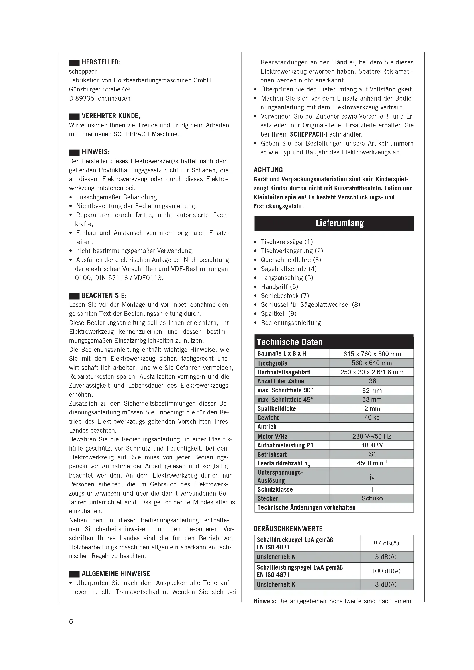 HERSTELLER: scheppach Fabrikation von Holzbearbeitungsmaschinen GmbH Günzburger Straße 69 D-89335 Ichenhausen VEREHRTER KUNDE, Wir wünschen Ihnen viel Freude und Erfolg beim Arbeiten mit Ihrer neuen SCHEPPACH Maschine. HINWEIS: Der Hersteller dieses Elektrowerkzeugs haftet nach dem geltenden Produkthaftungsgesetz nicht für Schäden, die an diesem Elektrowerkzeug oder durch dieses Elektro- werkzeug entstehen bei: