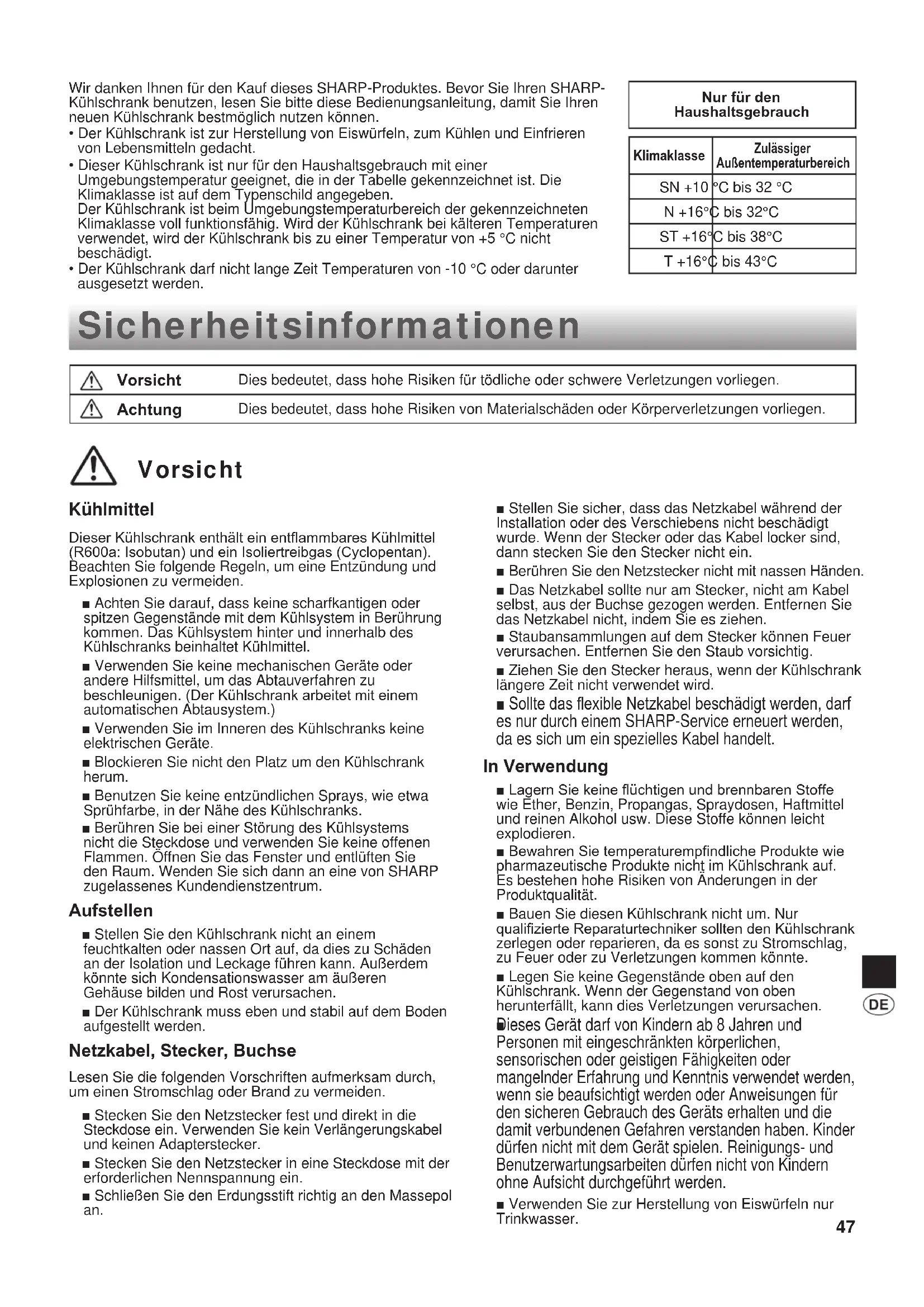 Dieses Gerät darf von Kindern ab 8 Jahren und Personen mit eingeschränkten körperlichen, sensorischen oder geistigen Fähigkeiten oder mangelnder Erfahrung und Kenntnis verwendet werden, wenn sie beaufsichtigt werden oder Anweisungen für den sicheren Gebrauch des Geräts erhalten und die damit verbundenen Gefahren verstanden haben. Kinder dürfen nicht mit dem Gerät spielen. Reinigungs- und Benutzerwartungsarbeiten dürfen nicht von Kindern ohne Aufsicht durchgeführt werden. ■ Verwenden Sie zur Herstellung von Eiswürfeln nur Trinkwasser. Sicherheitsinformationen Vorsicht Dies bedeutet, dass hohe Risiken für tödliche oder schwere Verletzungen vorliegen. Achtung Dies bedeutet, dass hohe Risiken von Materialschäden oder Körperverletzungen vorliegen. Vorsicht Nur für den Haushaltsgebrauch Klimaklasse Zulässiger Außentemperaturbereich SN +10 °C bis 32 °C N +16°C bis 32°C ST +16°C bis 38°C T +16°C bis 43°C (B717).indb 47 2016/02/15 11:28:2148 Pege und reinigung ■ Zum Austausch der Glühlampe ziehen Sie den Stecker des Kühlschrankes aus der Steckdose, um einen Stromschlag zu vermeiden. ■ Spritzen Sie kein Wasser auf die Außen- oder Innenwände. Dies kann zu Rost und zur Verschlechterung der elektrischen Isolierung führen. Störung ■ Wenn Sie einen Verbrennungsgeruch riechen, ziehen Sie sofort den Netzstecker heraus. Wenden Sie sich dann an ein von SHARP zugelassenes Kundendienstzentrum. ■ Wenn Gas ausgeströmt ist, öffnen Sie ein Fenster, um den Raum zu belüften. Berühren Sie keinesfalls den Kühlschrank oder die Steckdose. Entsorgung ■ Stellen Sie sicher, dass der Kühlschrank keine Gefahr für Kinder darstellt, wenn Sie ihn vor der Entsorgung aufbewahren (entfernen Sie z. B. die magnetischen Türdichtungen, damit sich Kinder nicht einsperren). ■ Dieser Kühlschrank muss vorschriftsmäßig entsorgt werden. Bringen Sie ihn zu einer professionellen Abfallverwertungsanlage für entammbares Kühlmittel und Isoliertreibgase. Transport ■ Wenn Sie Ihren Kühlschrank aufstellen oder verschieben, verwenden Sie eine Schutzmatte, um den Boden vor Schäden zu schützen. ■ Tragen Sie den Kühlschrank mit Hilfe der an der Rück- und Unterseite bendlichen Tragegriffe. Wenn Sie den Kühlschrank falsch hochheben, kann dies Verletzungen verursachen. Achtung In Verwendung ■ Den Kompressor und die dazugehörigen Teile nicht berühren, da sie während des Betriebs sehr heiß werden und Sie sich an den Kanten der Metallteile verletzen könnten. ■ Berühren Sie Lebensmittel im Tiefkühlabteil nicht mit nassen Händen. Dies kann zu Frostbeulen führen. ■ Stellen Sie keine Flaschengetränke und Dosen in das Tiefkühlabteil. Insbesondere wenn die „Express-Kühlung“ läuft, besteht ein hohes Risiko, dass die Glasaschen zerplatzen können. ■ Öffnen oder schließen Sie die Tür nicht, wenn andere Personen eine Hand in der Nähe der Tür haben. Es besteht die Gefahr, dass andere Personen ihre Finger in der Tür einklemmen können. ■ Platzieren Sie keine übergroßen Gegenstände in die Türablagefächer. Wenn der Gegenstand aus den Ablagefächern herunterfällt, kann dies eine Verletzung verursachen. Rückseite Unterseite (B717).indb 48 2016/02/15 11:28:2149 Free standing type Aufstellen Freistehender Typ 90mm 60mm 60mm 1180 mm 1500 mm