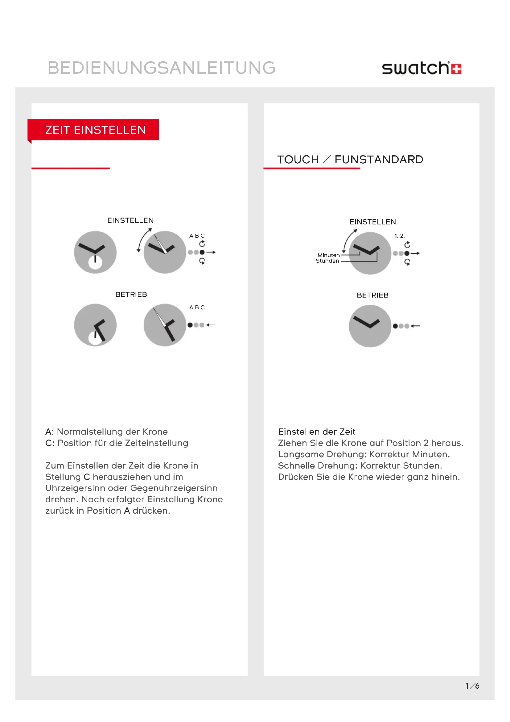 Alarm-Modus ein-/ausschalten, Einstellen der Alarmzeit Drücken Sie kurz auf die Krone und die Zeiger gehen auf den aktuellen Modus on oder o. Drücken Sie die Krone erneut, um den Modus zu wechseln. Ziehen Sie die Krone auf Position 1 und die Zeiger gehen automatisch auf die zuletzt eingestellte Alarmzeit. Um diese zu ändern, drehen Sie an der Krone. (Langsame Drehung: Minuten; schnelle Drehung: Stunden).BEDIENUNGSANLEITUNG 5/6 ~4 Sek. TOUCH GAME Tippen Sie auf Ihre Swatch. Beide Zeiger gehen auf 12 Uhr und machen mindestens eine ganze Umdrehung. WICHTIG: Wenn die Zeiger nicht exakt auf 12 Uhr ausgerichtet sind, müssen sie justiert werden. Zeiger stoppen per Zufall und zeigen einige Sekunden das Spielresultat… ...und kehren dann wieder zur Zeitangabe zurück. WICHTIG: Wenn die Zeiger nicht genau ON-OFF zeigen (Alarmmodus), dann muss die Touch Alarm neu eingestellt werden (z.B. nach Batterie- wechsel oder starker Erschüt- terung). ALARM-DEMO2 Sek. Um die Alarm-Demo zu starten, drücken Sie 2 Sek. lang auf die Krone. Um sie wieder zu stoppen, drücken Sie die Krone erneut. Wenn Sie die Krone wieder hineindrücken, gehen die Zeiger wieder zurück zur Zeitanzeige und der Alarm-Modus ist auf “on“.BEDIENUNGSANLEITUNG 6/6 EINSTELLENABLESEN TAUCHFUNKTION: VERGANGENE ZEIT Gebrauch des Einstellrings Zur Einstellung der Startzeit und Dauer einer Aktivität, den Markierungspunkt des Einstellrings genau am Minutenzeiger platzieren. Die Dauer berechnet sich ab dem Markierungspunkt angegebenen Zeit- punkt. Die vergangene Zeit wird vom Minutenzeiger durch Hinweis auf die Zahl am Einstellring angezeigt. WICHTIG: Nach einem Aufenthalt im Salzwasser sollte die Scuba 200 Chrono stets mit frischem Wasser gespült werden. ACHTUNG: Die Irony Scuba 200 Chrono ist keine professionelle Taucheruhr. WICHTIGER