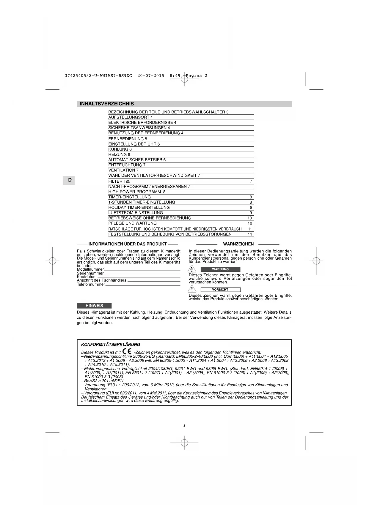 Dieses Produkt ist mit -Zeichen gekennzeichnet, weil es den folgenden Richtlinien entspricht: – Niederspannungsrichtilinie 2006/95/EG (Standard: EN60335-2-40:2003 (incl. Corr.:2006) + A11:2004 + A12:2005 + A13:2012 + A1:2006 + A2:2009 with EN 60335-1:2002 + A11:2004 + A1:2004 + A12:2006 + A2:2006 + A13:2008 + A14:2010 + A15:2011). – Elektromagnetische Verträglichkeit 2004/108/EG, 92/31 EWG und 93/68 EWG. (Standard: EN55014-1 (2006) + A1(2009) + A2(2011), EN 55014-2 (1997) + A1(2001) + A2 (2008), EN 61000-3-2 (2006) + A1(2009) + A2(2009), EN 61000-3-3 (2008) – RoHS2 n.2011/65/EU. – Verordnung (EU) nr. 206/2012, vom 6 März 2012, über die Spezifikationen für Ecodesign von Klimaanlagen und Ventilatoren. – Verordnung (EU) nr. 626/2011, vom 4 Mai 2011, über die Kennzeichnung des Energieverbrauches von Klimaanlagen. Bei falschem Einsatz des Gerätes und/oder Nichtbeachtung auch nur von Teilen der Bedienungsanleitung und der Installatinsanweisungen wird diese Erklärung ungültig. 3742540532-U-AWIAS7-BS9DC 20-07-2015 8:49 Pagina 2D